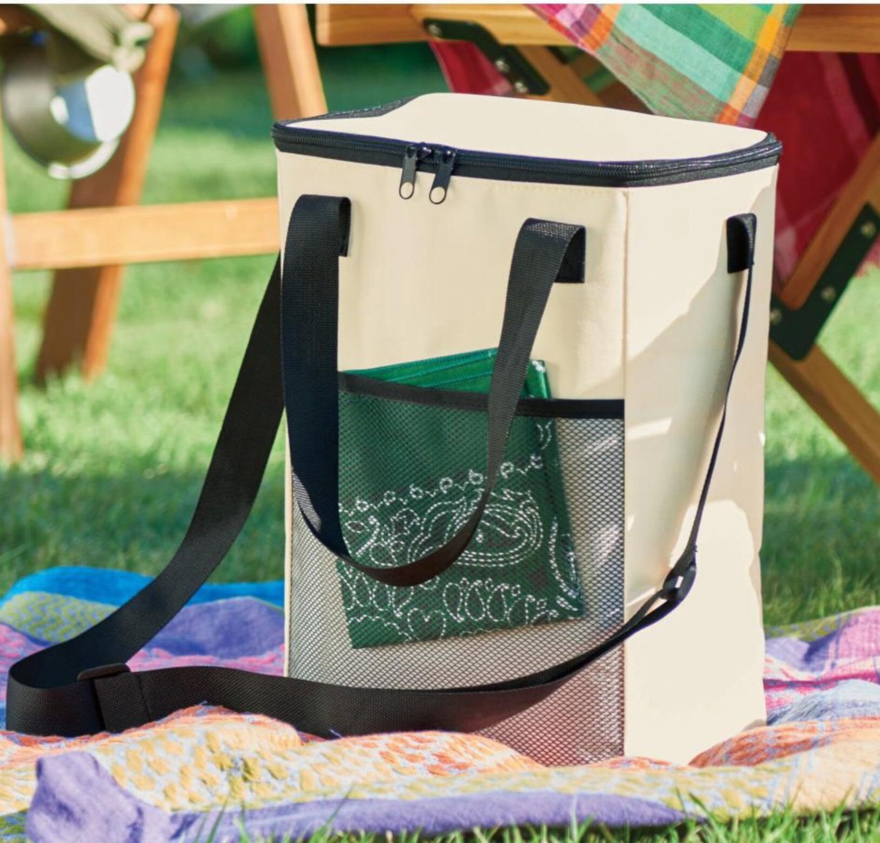 レジャーシートや紙皿の収納に便利なメッシュポケット付き(フロント)