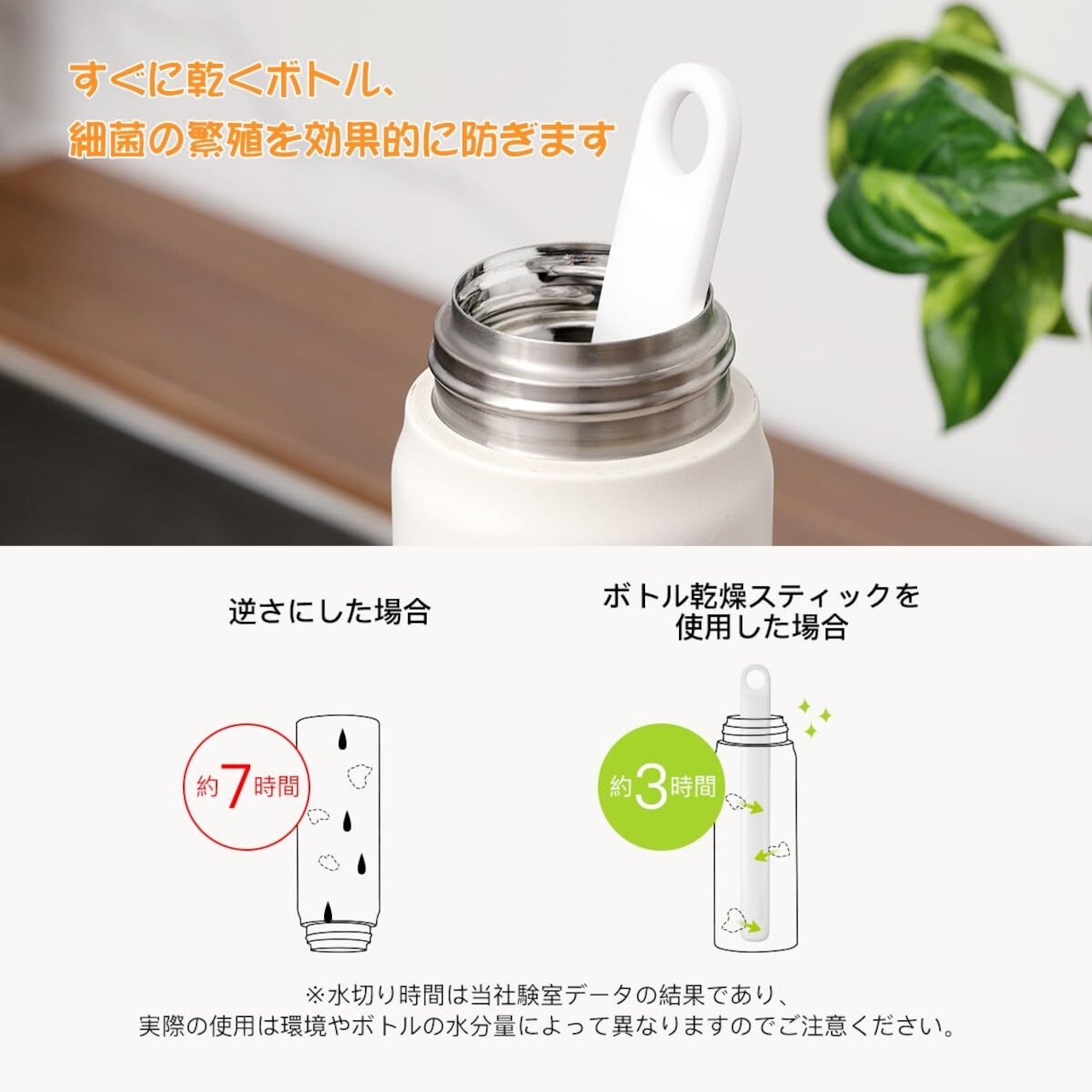 【素早く乾かす】ボトル乾燥スティックは洗った後の水筒の中に残った水を素早く乾かし、乾燥した衛生的な状態に保ち、細菌の繁殖を効果的に防ぎます。