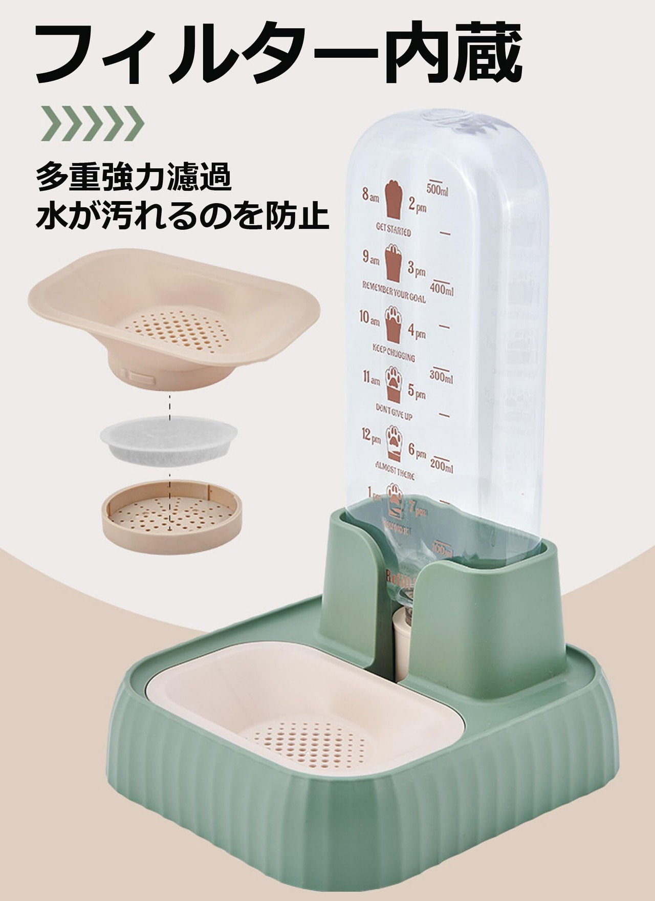 【高品質のフィルター内蔵】ペット 水飲み器は、上質のフィルター付きカートリッジで、多重強力濾過。ペットボトルの中にホコリやペットの毛が入り、水が汚れるのを防ぎます。ウサギのために水飲み器て、ボトルの中が洗えるし、組み立ても簡単で、食べ易く飲み易い!床に直置きしていますが餌も水もほぼこぼれません。逆にすぐとれるので洗いやすいですが…。