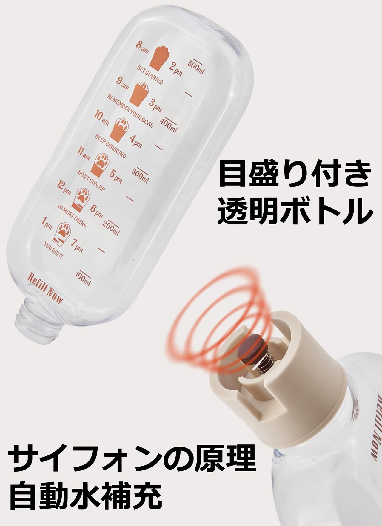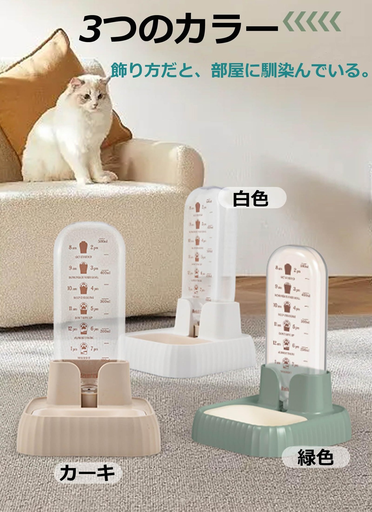 【おしゃれ透明のペット水飲み器】色合いやデザインの良さと、給水が楽そうだったのでコンパクトでかわいらしい。高品質のPP、PETとABS素材、見た目は可愛いです。透明で中身が見やすく、水の状況がよくわかり水の容量も簡単に把握することができるます。目盛り付き透明ボトルで、ペットの飲水量が一目でわかります。飾り方だと、邪魔にはなるけどそれ程目立たずに部屋に馴染んでいる。