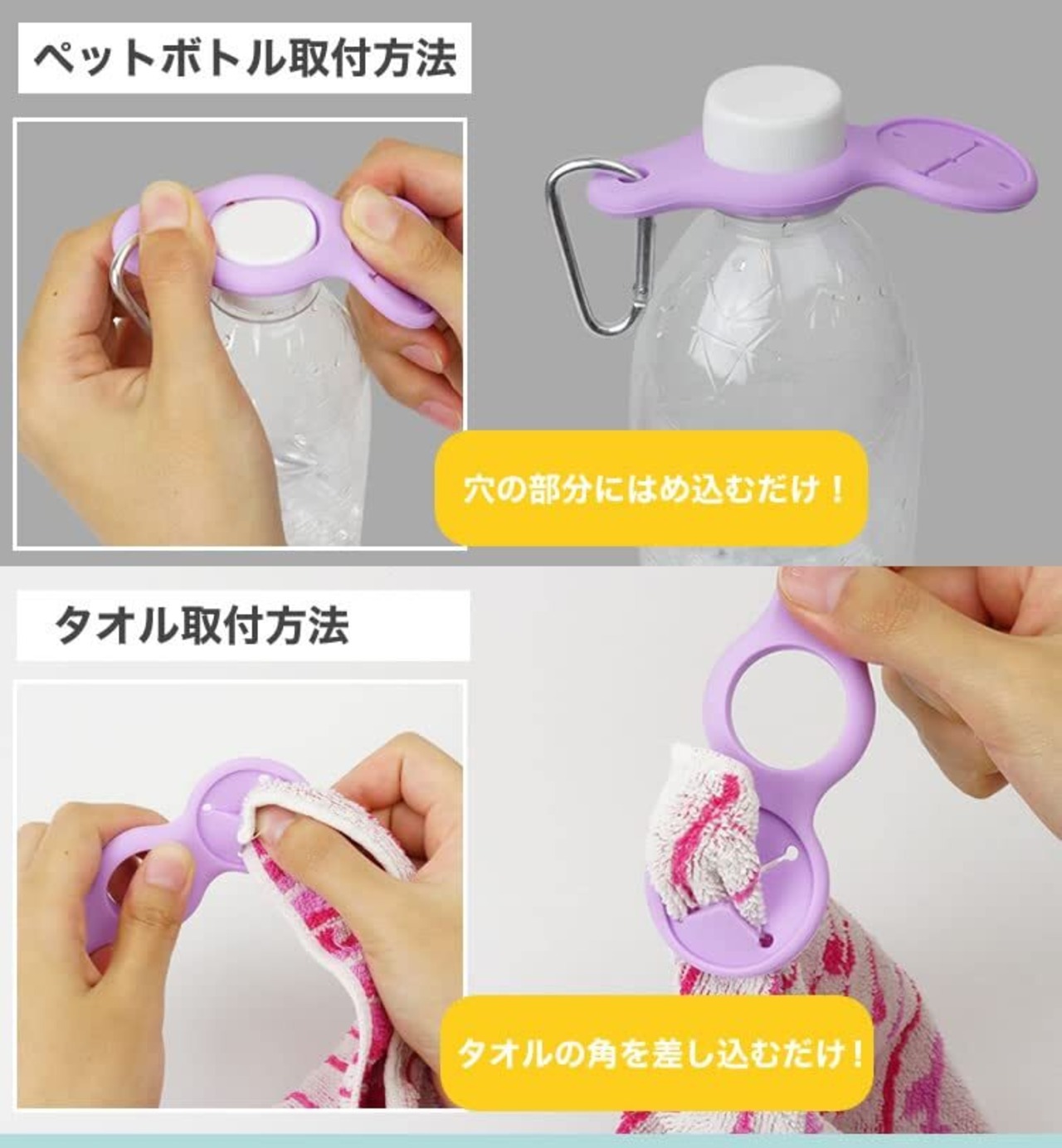 リュックやカバンに取りつければ、タオルやドリンクの持ち運びに便利。