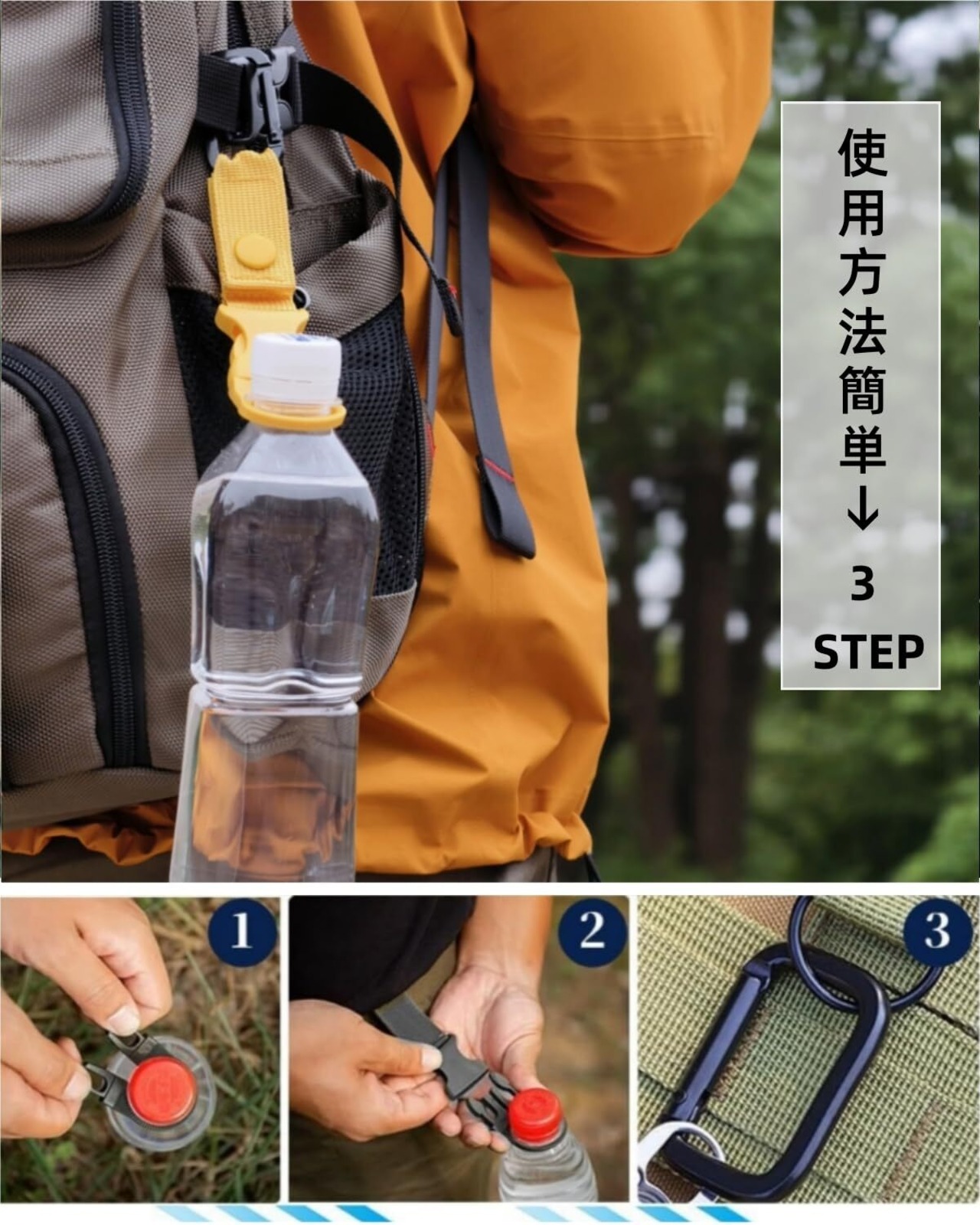 【固定方法2WAY】固定方法2WAYで万能なペットボトルホルダーです!❶カラビナでバッグやベルトループなど様々な場所に固定できます。❷マジックテープとボタンのダブルロックでベルトなどにガッチリ固定することも可能です。アウトドアや登山、サバゲーなどハードな場面で役立ちます。