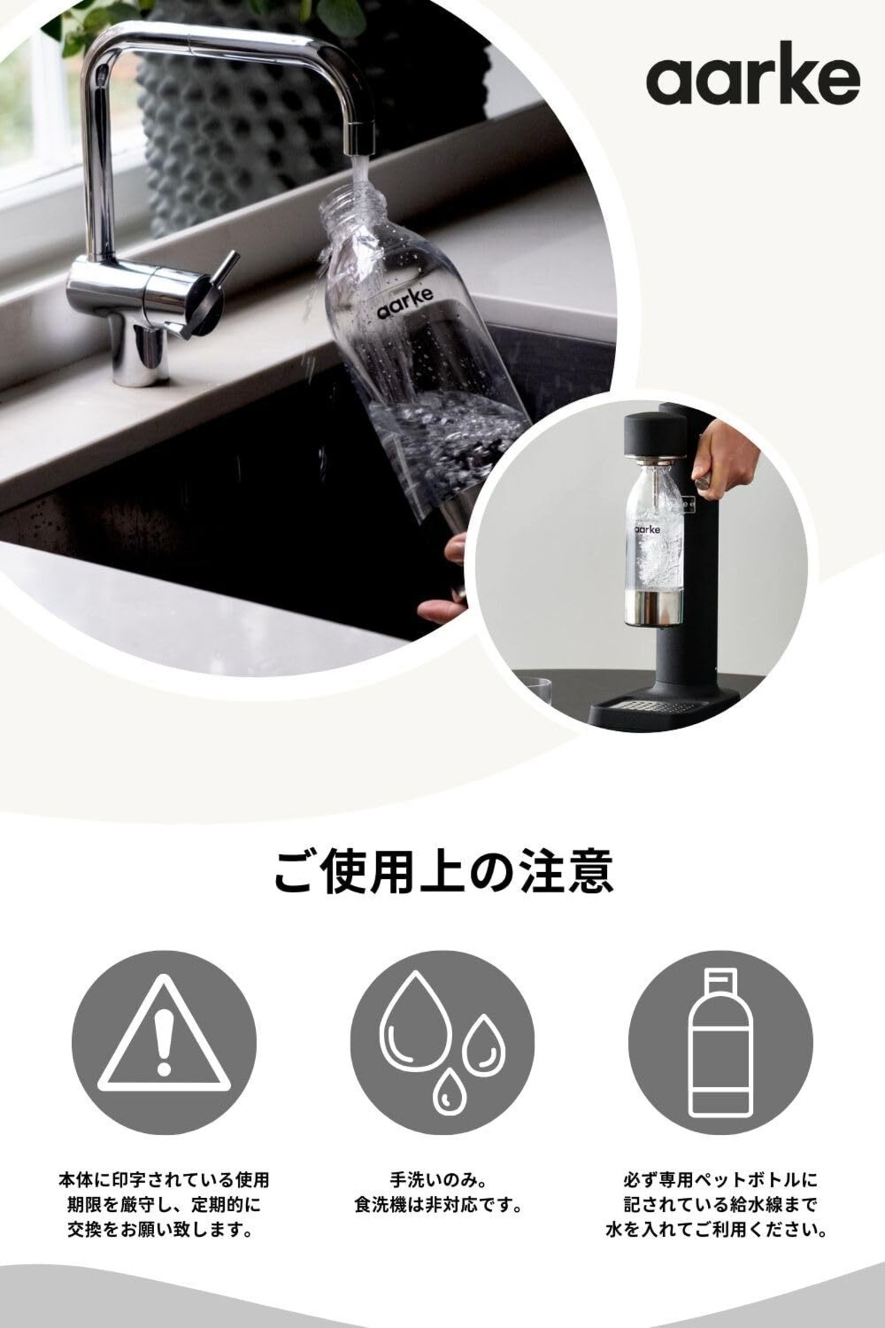 【商品仕様】最大容量450ml、メモリの線まで水を入れてお使いください。冷水以外はご利用になれません。※推奨:冷水(4-6℃)最大40 ℃未満。必ず専用ペットボトルに記されている給水線(目盛線)まで水を入れてご利用ください。 目盛線を守らない場合、水が本体の中に入ってしまうことがあり、時間が経つにつれて破損する可能性があります。ジュースやワイン、牛乳などは絶対に炭酸化しないでください。 その他、専用ボトルには果物、野菜、ハーブ、フレーバー系の化合物やシロップを入れないでください。また、気の抜けた古いソーダ水の再炭酸化はしないでください。※専用ペットボトルを冷凍庫には入れないでください。※バクテリアの繁殖や悪臭がしないよう、専用ペットボトルは常に清潔な状態で保管してください。※他社の炭酸水メーカーに、AARKEのボトルを絶対に使用しないでください。※AARKE以外の他社メーカーのボトルはご利用になれません。強引に装着する行為は故障や事故の原因になります。