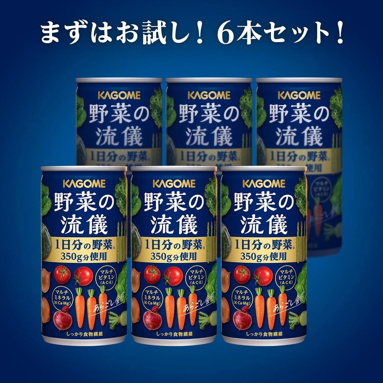 カゴメ 野菜の流儀 6本パック (190g×6本)は、1日分の野菜※350g分使用(※厚労省推進・健康日本21の目標値) 毎日続けていただきたいから、野菜のあらごし食感と野菜本来のおいしさ、栄養※にもこだわりました。(※食物繊維、マルチミネラル(K・Ca・Mg)、マルチビタミン(A・C・E)) 野菜飲料は原料野菜の全成分を含むものではありませんが、不足しがちな野菜を補うためにお役立てください。