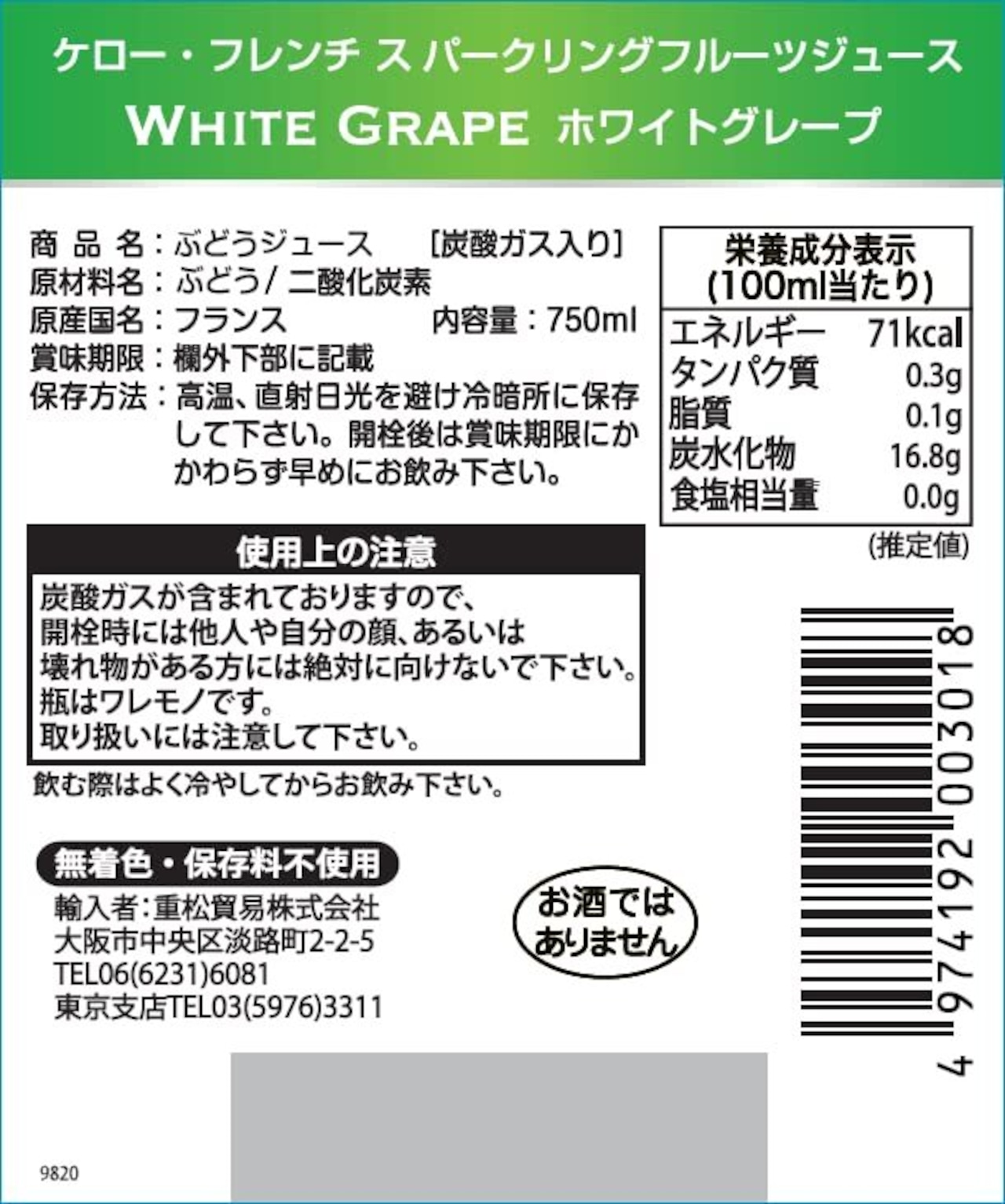 炭酸ガスが含まれておりますので、開栓時には他人や自分の顔、あるいは壊れ物がある方には絶対に向けないでください。瓶は割れ物です。取扱いには注意してください。