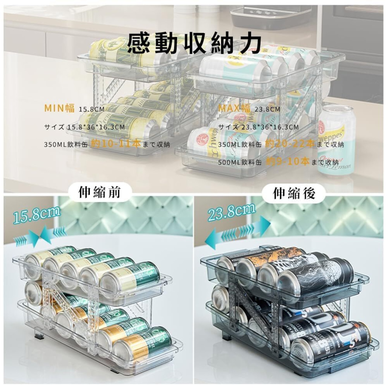 【無段階調整 スムーズに伸縮】 冷蔵庫のサイズに合わせて幅(15.8-23.8cm)はスムーズに調整できるので、スペースを有効利用できますよ。そのため市販されたほとんどの缶飲料(250ml 350ml 500ml)に対応しています。