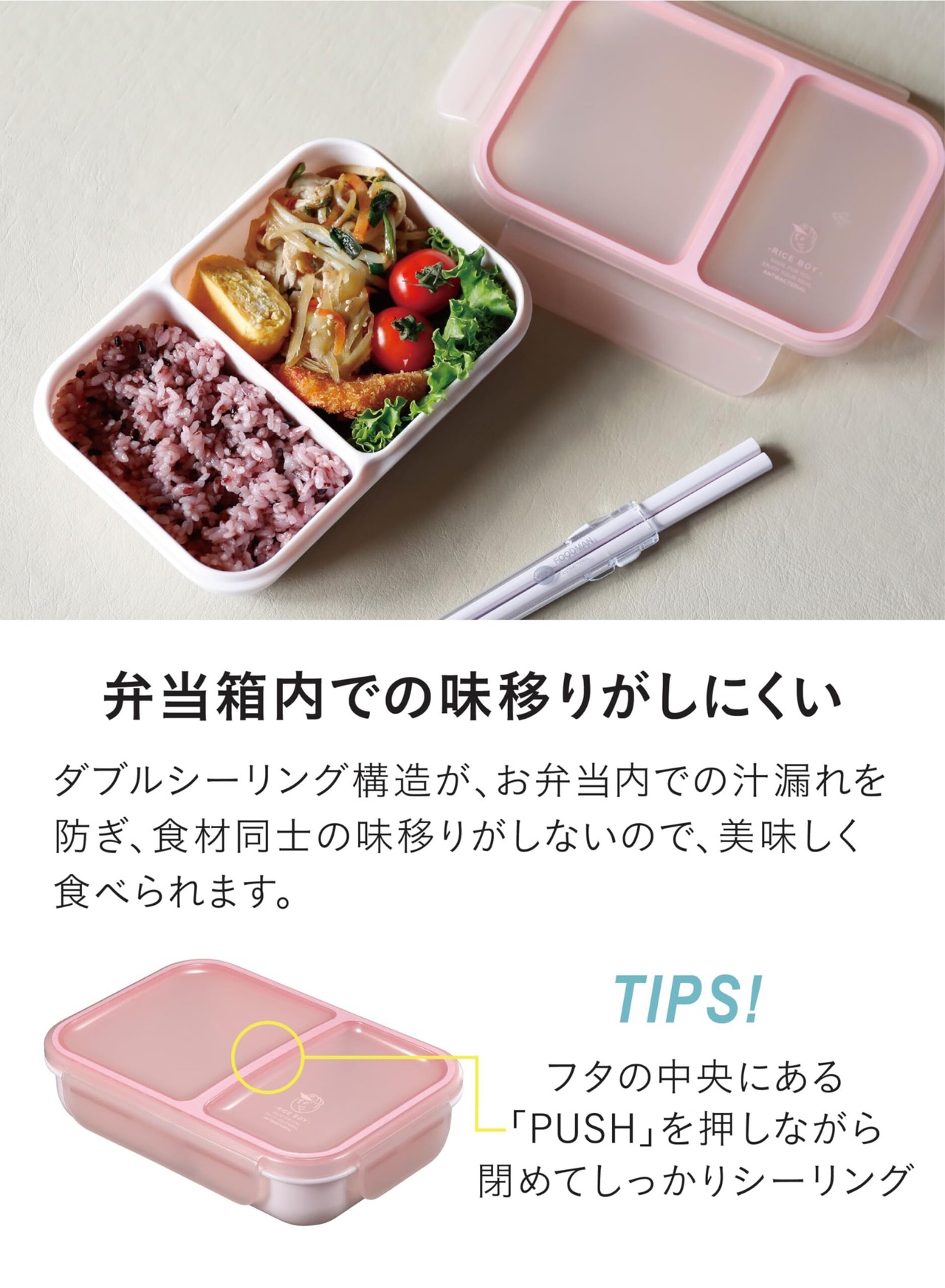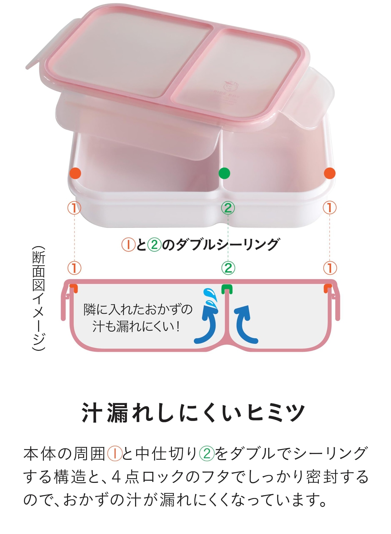 一体型のパッキンと4点ロックで汁漏れを防止します!本体の周囲と中仕切りをシーリングするWシーリング構造。お弁当内での汁移りも防ぐので、おかずなどの味移りも防止します。※本商品は密閉容器ではありませんので、水分の多い物や汁物は入れないでください。漏れの原因になります。