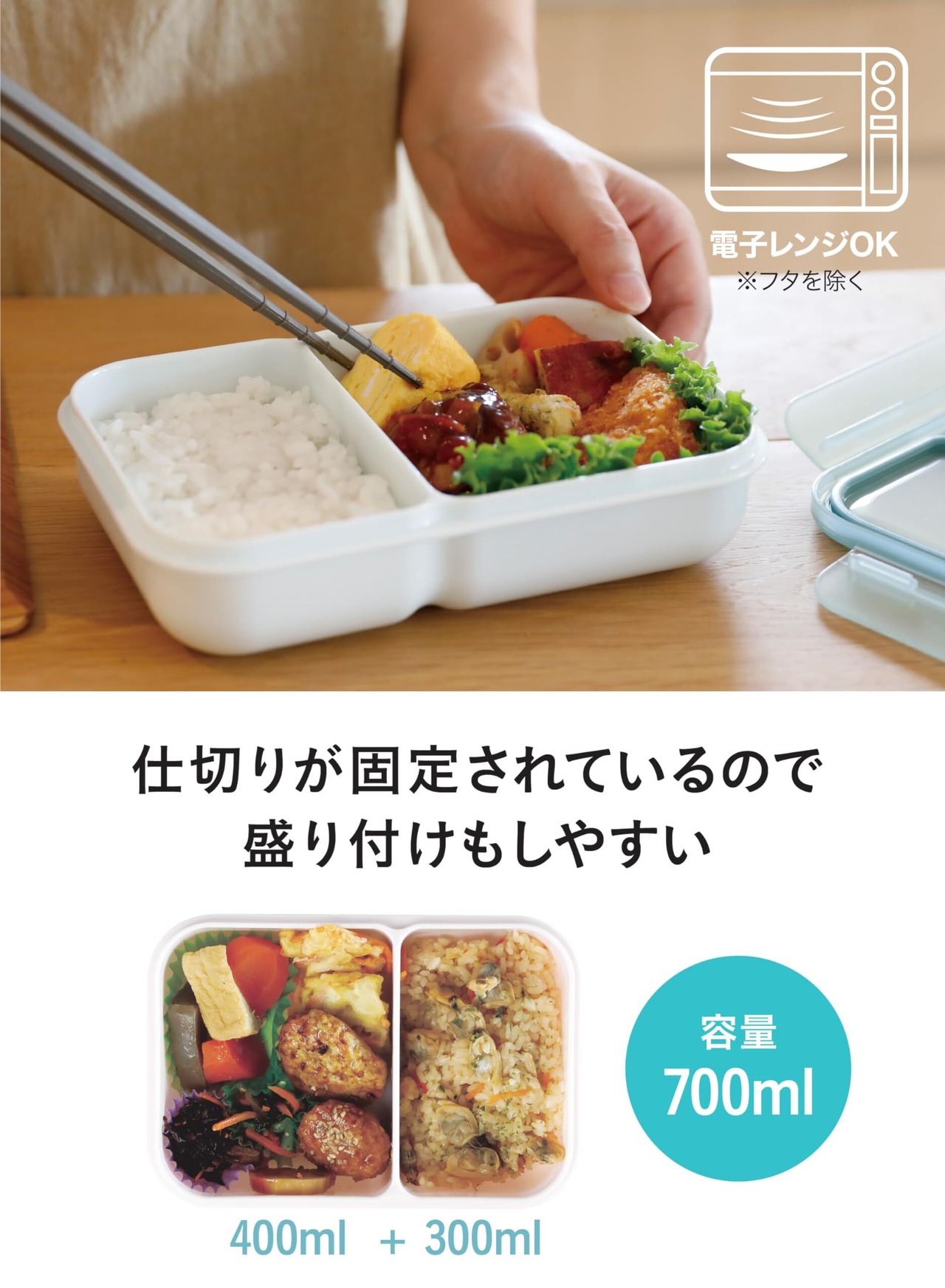 仕切りが固定されているので、おかずとご飯を迷わず盛り付けられます。本体容量は300mlと400mlの合わせて700mlで、その日の気分に合わせて食べたい量を変えられます。