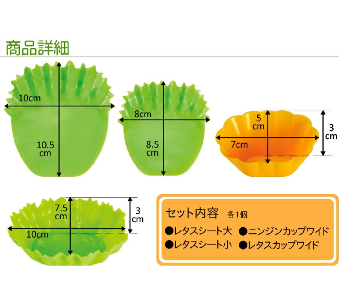 サイズ:ニンジンカップワイド/幅7×奥行5×高さ3cm レタスカップワイド/幅10×奥行7.5×高さ3cm レタスシート大/縦10.5×横10cm レタスシート小/縦8.5×横8cm