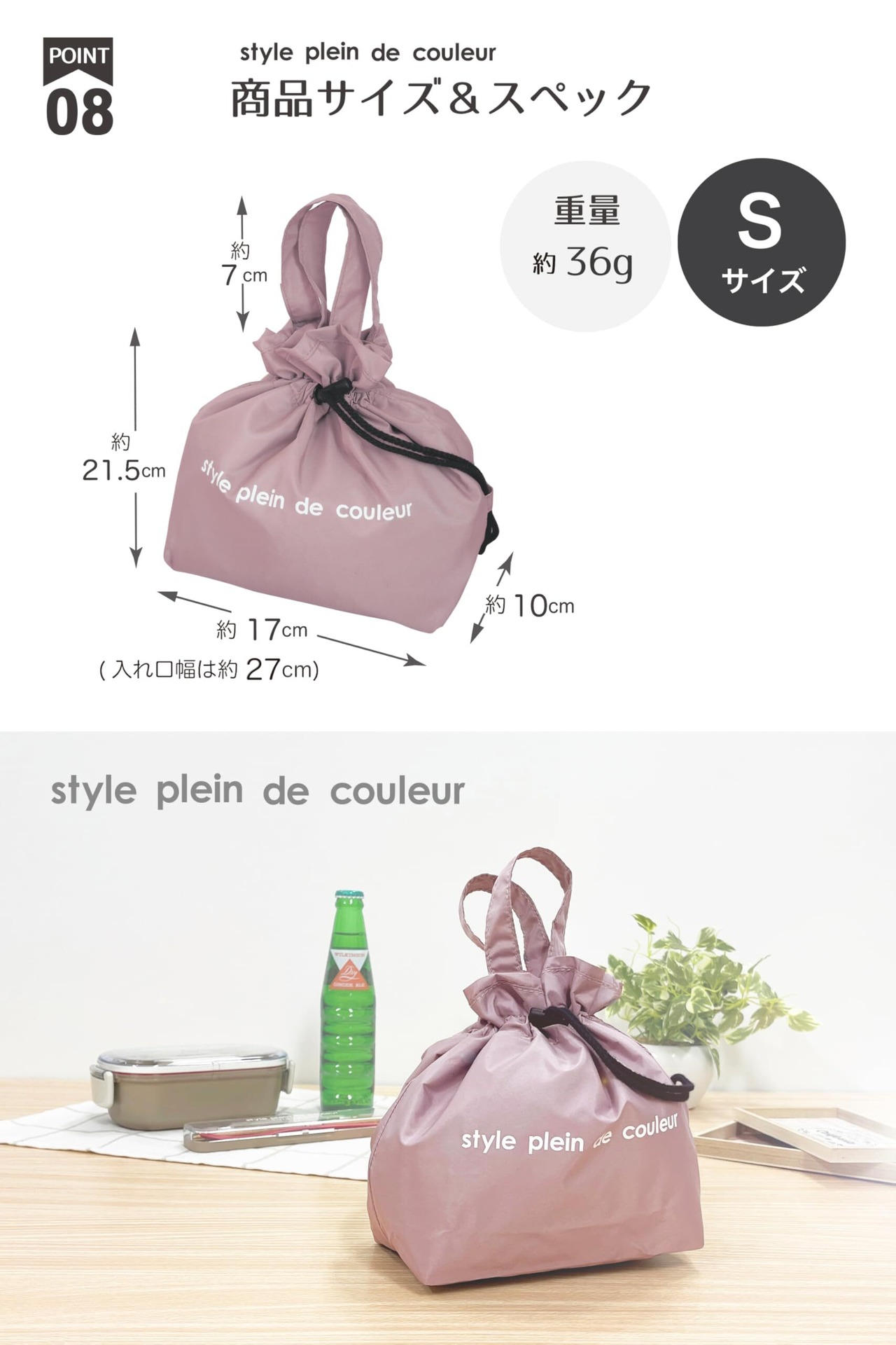 [style plein de couleur] 保冷 お弁当 巾着 「ランチ巾着袋」 お弁当バッグ 弁当箱 袋 ランチバック 小さめ ランチバッグ (ローズミスト,S)
