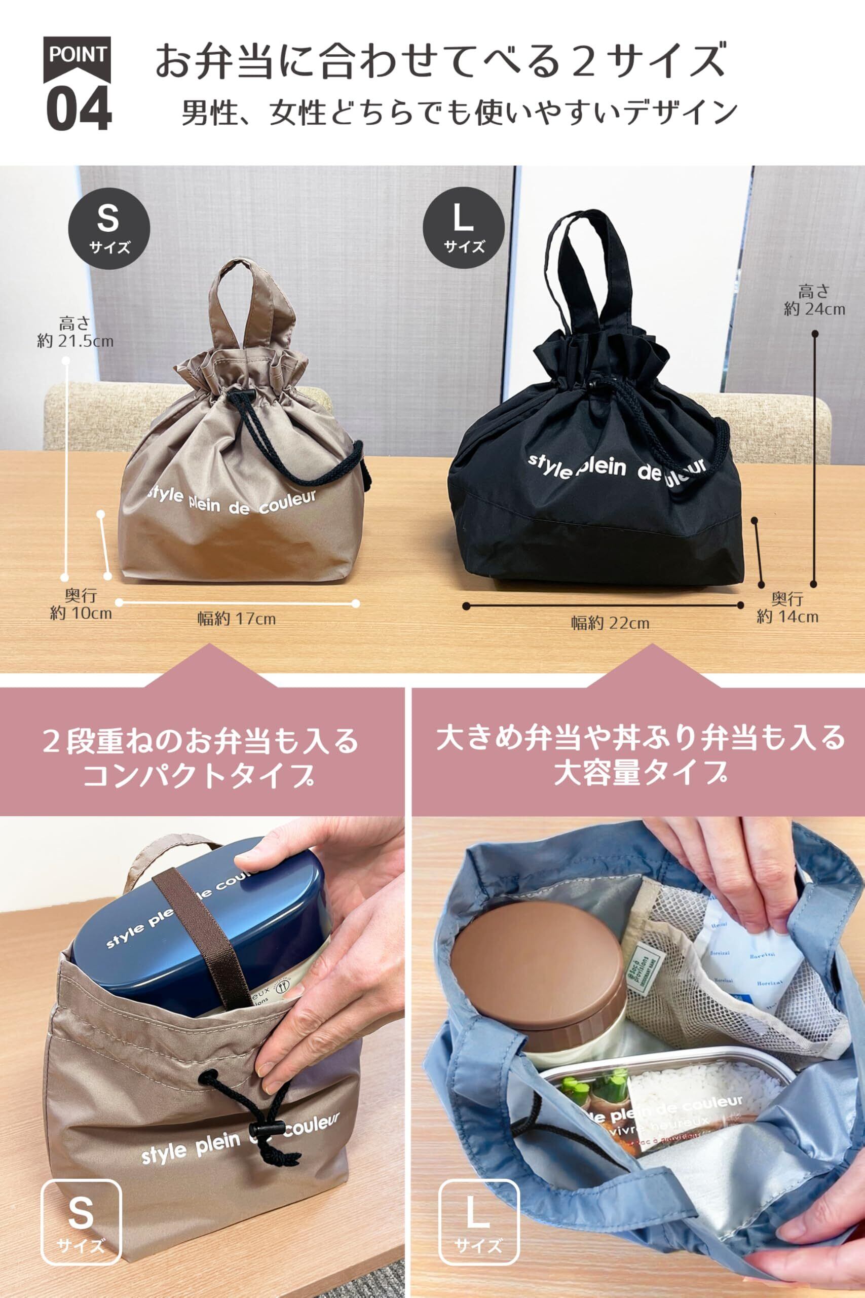 【お弁当に合わせて選べる2サイズ】Sサイズは子供や女性用、2段重ねのお弁当にぴったりのサイズ感。幼稚園や学童弁当にもおすすめです。Lサイズは大人用のお弁当とカトラリーをまとめて入れたり、小ぶりなお弁当箱を重ねて袋に入れる事ができます。学校、オフィス、遠足など、さまざまな場面にお使いいただけるお弁当用の保冷巾着(お弁当バッグ)です。
