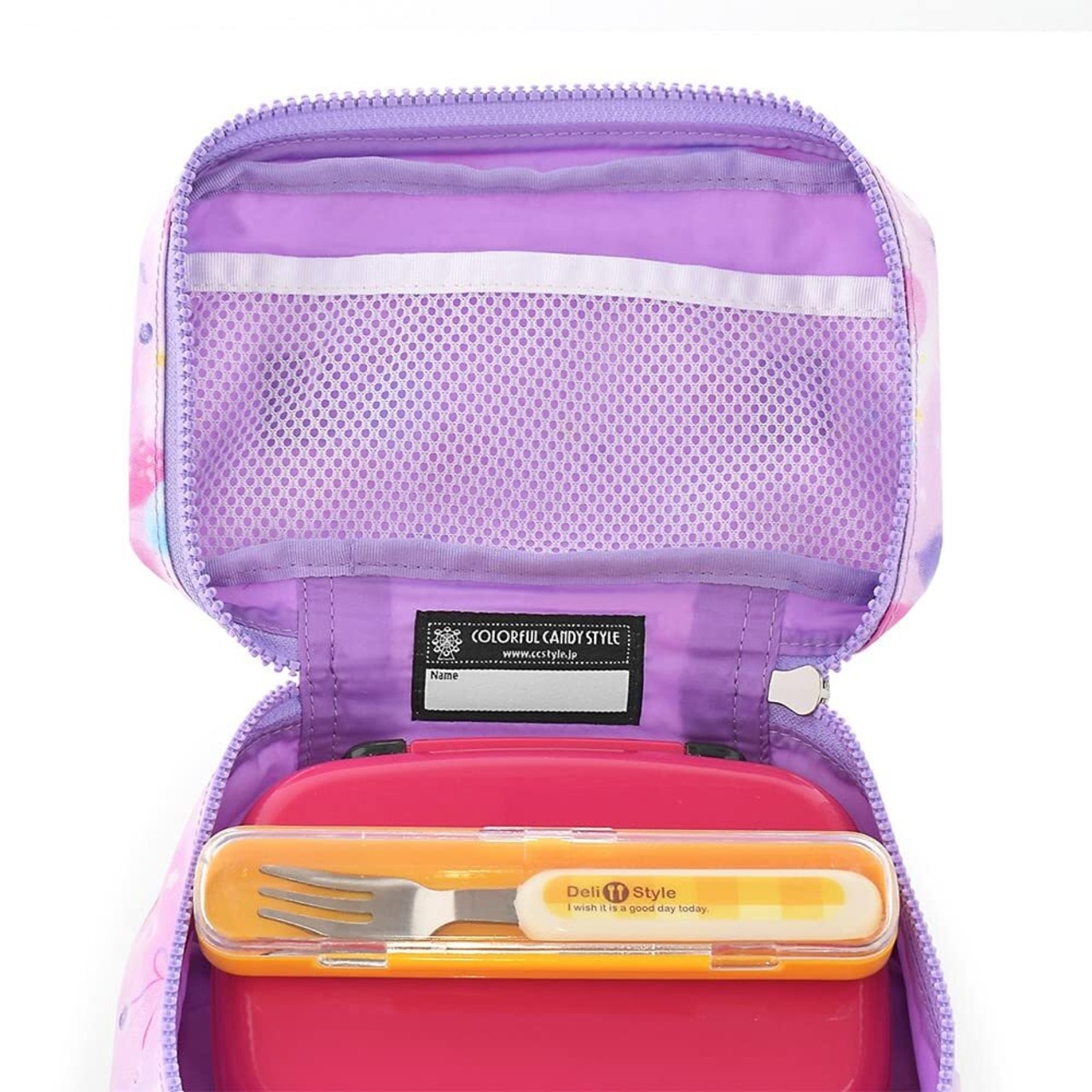 内側には保冷剤を入れるのに便利なメッシュポケット付きです。