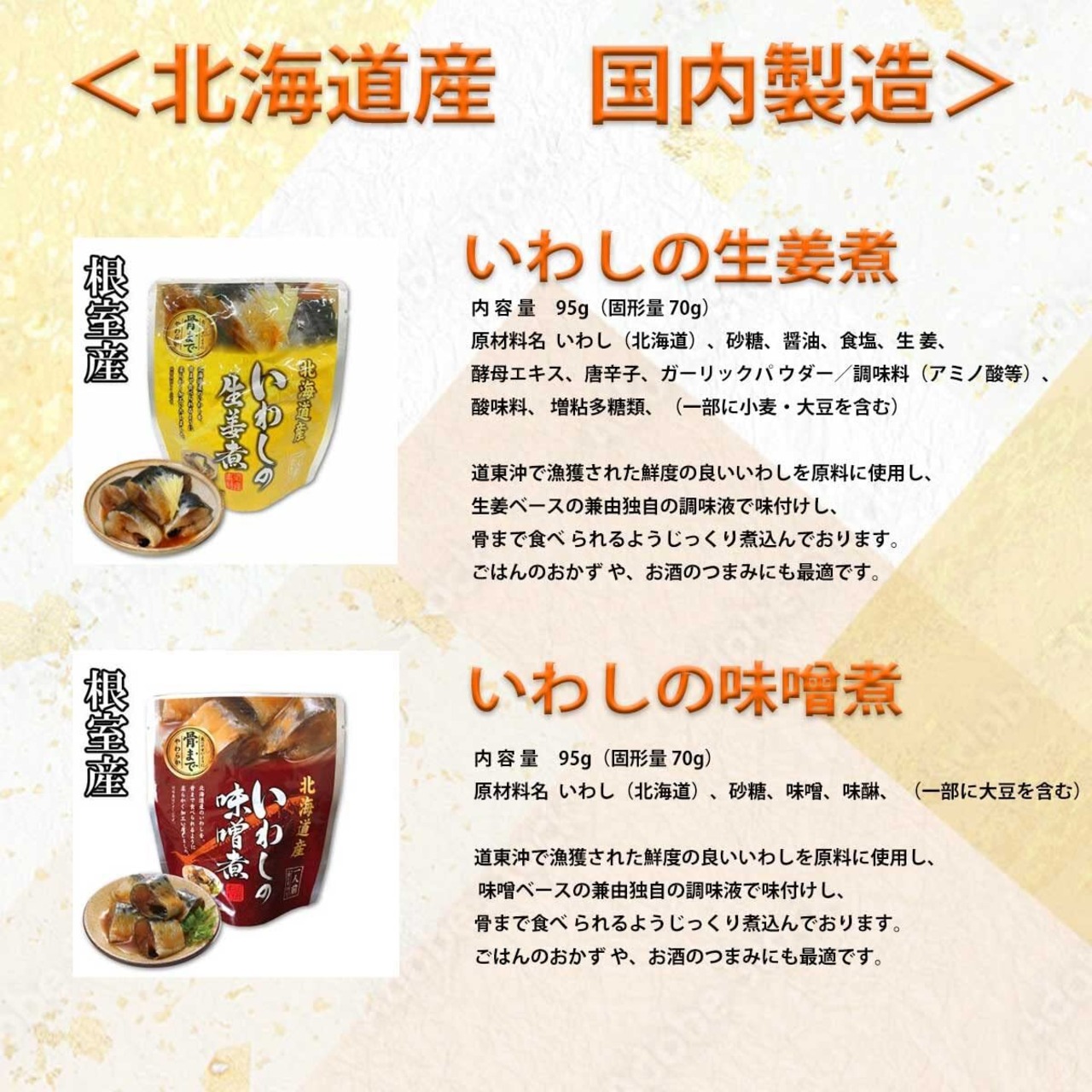 【内容】さんまの旨煮 さんまの味噌煮 いわしの味噌煮 いわしの生姜煮 ほたてバター醤油 さばの旨煮