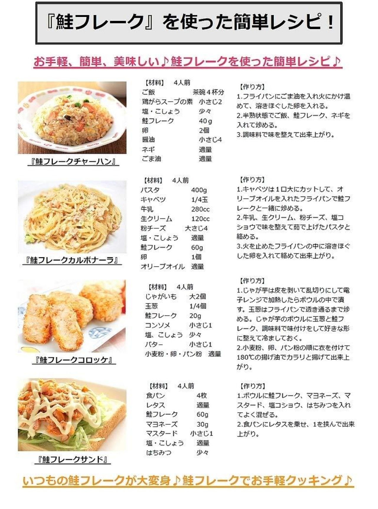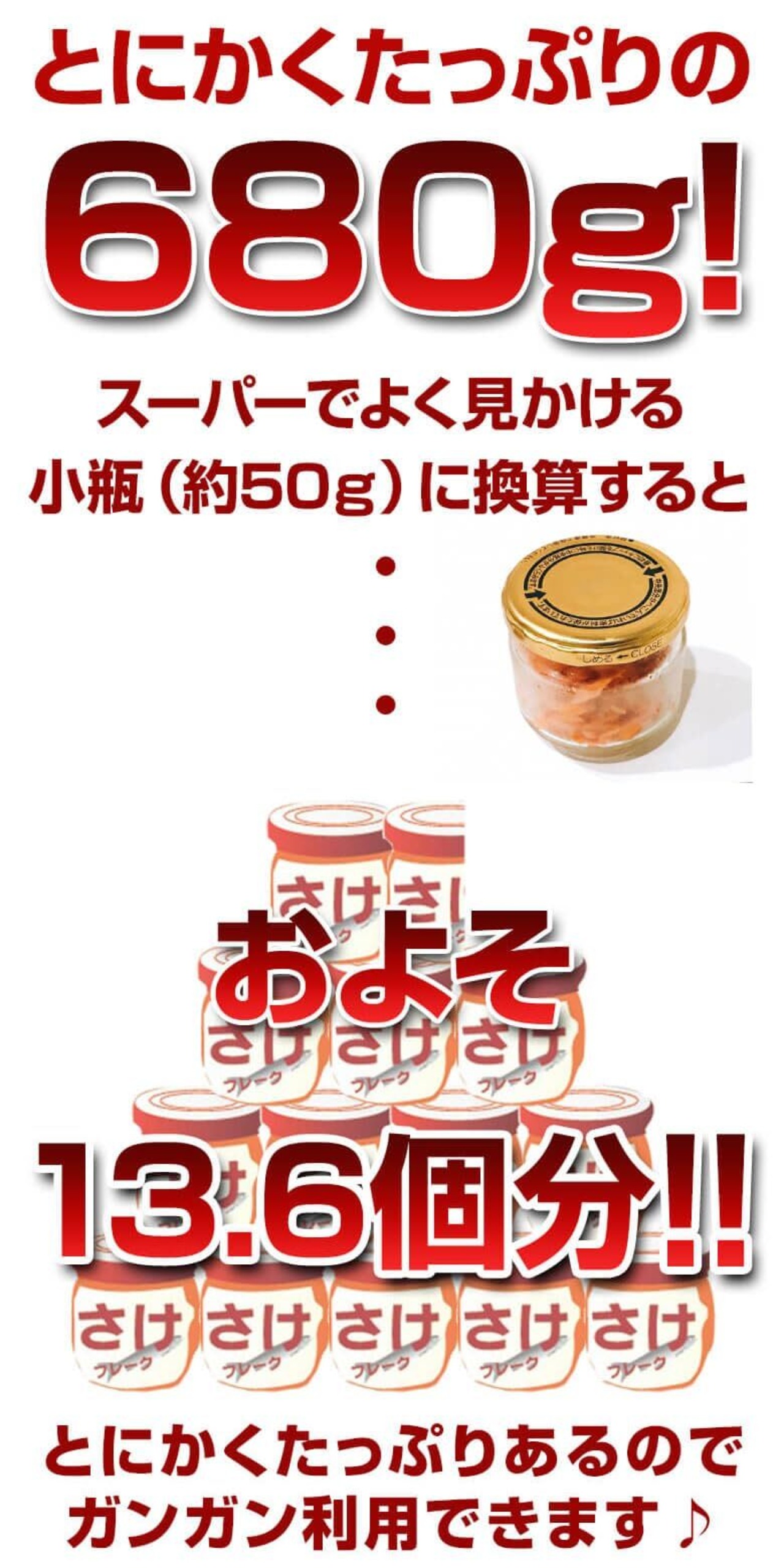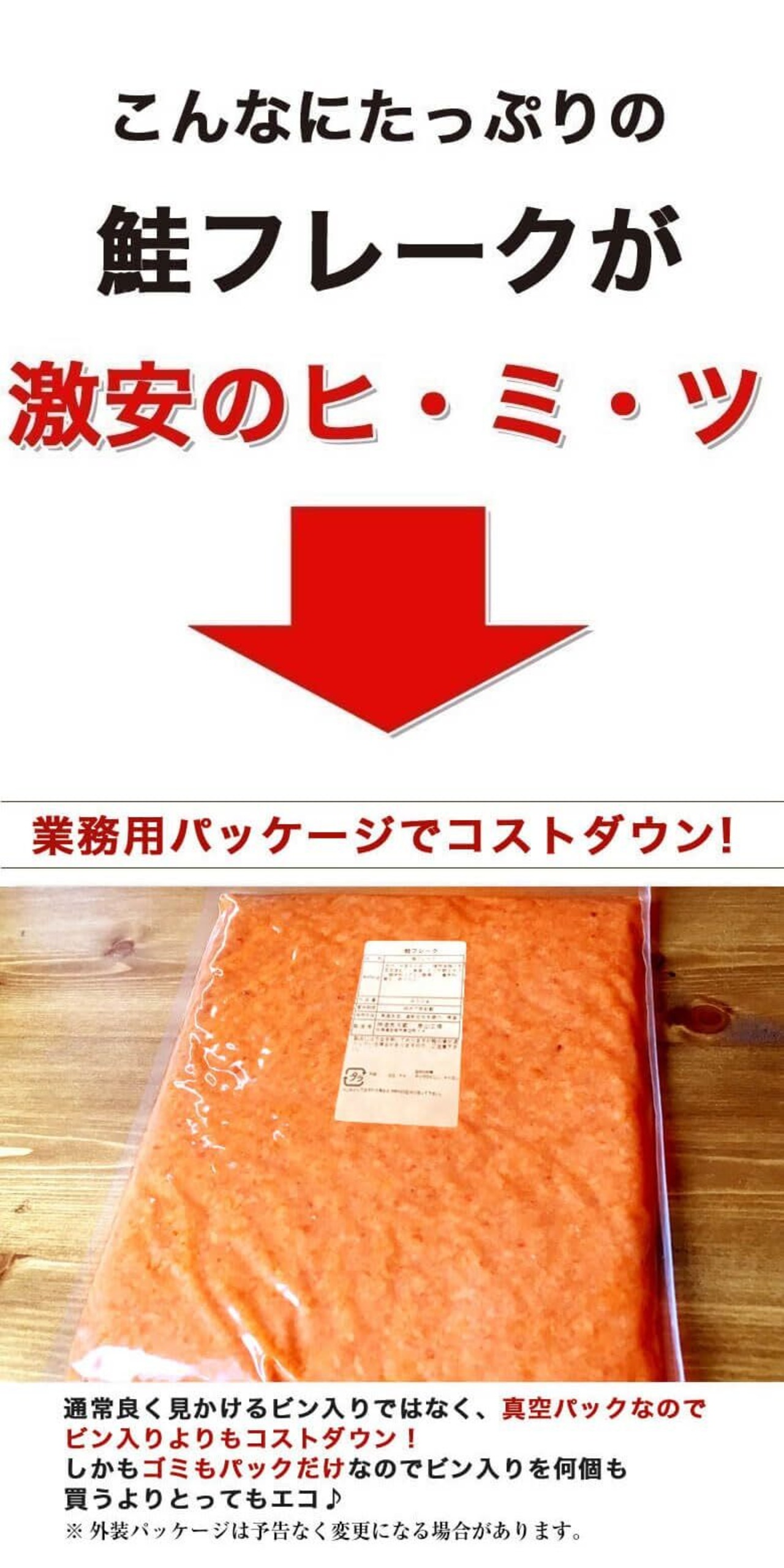 商品名:北海産 鮭フレーク 内容量:680g(340g×2袋) 原材料名:さけ(国産、ロシア他)、大豆たんぱく、植物油脂(大豆を含む)、食塩、かつお節エキス、調味料(アミノ酸等)、着色料(黄5、赤102)