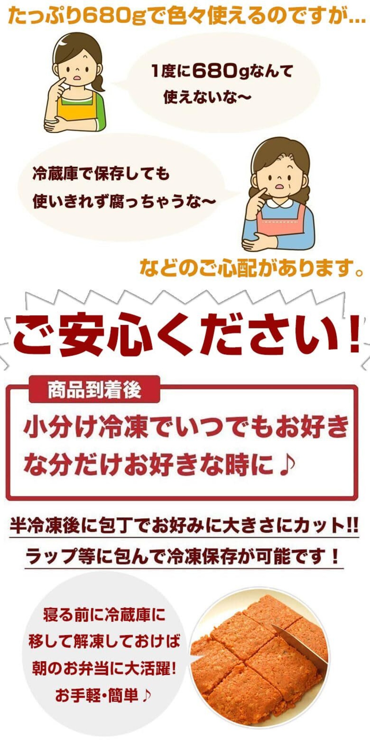 商品到着後、小分けに冷凍可能!いつでもお好きな分だけお好きな時にお召し上がり頂けます。※半冷凍後に包丁でお好みの大きさにカット!ラップ等に包んで保存して下さい。