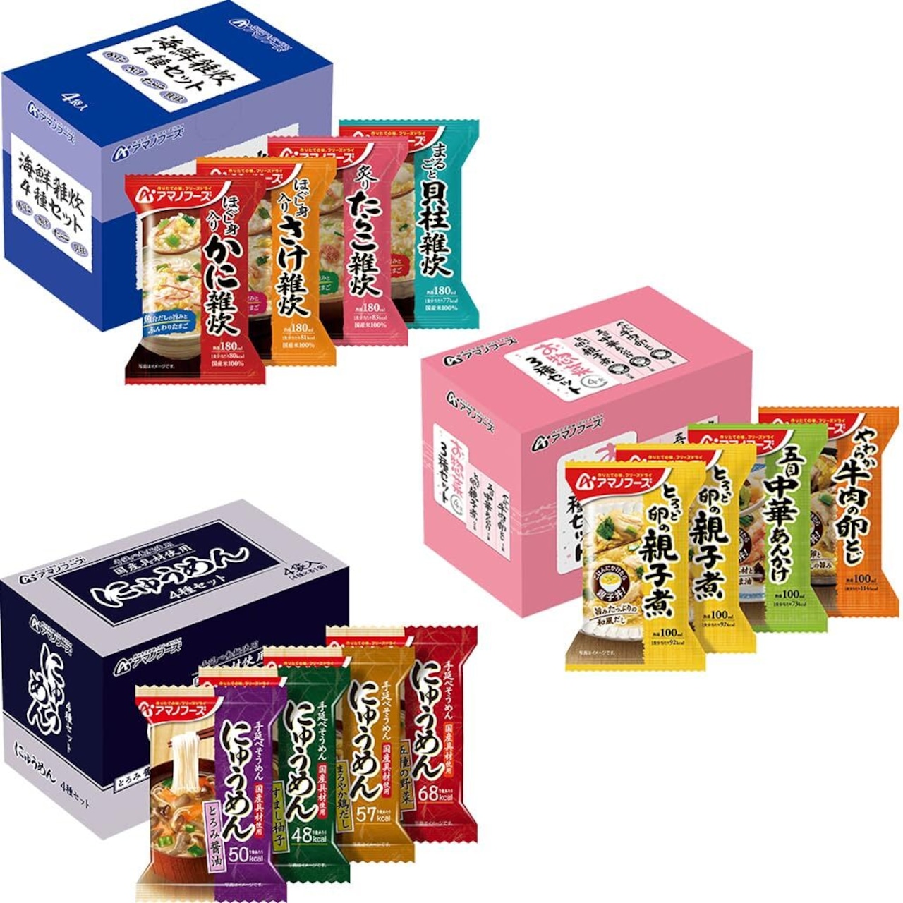 アマノフーズ「お惣菜3種セット4食」と「海鮮雑炊4種セット4食」と「にゅうめん4種セット4食B」のセット品