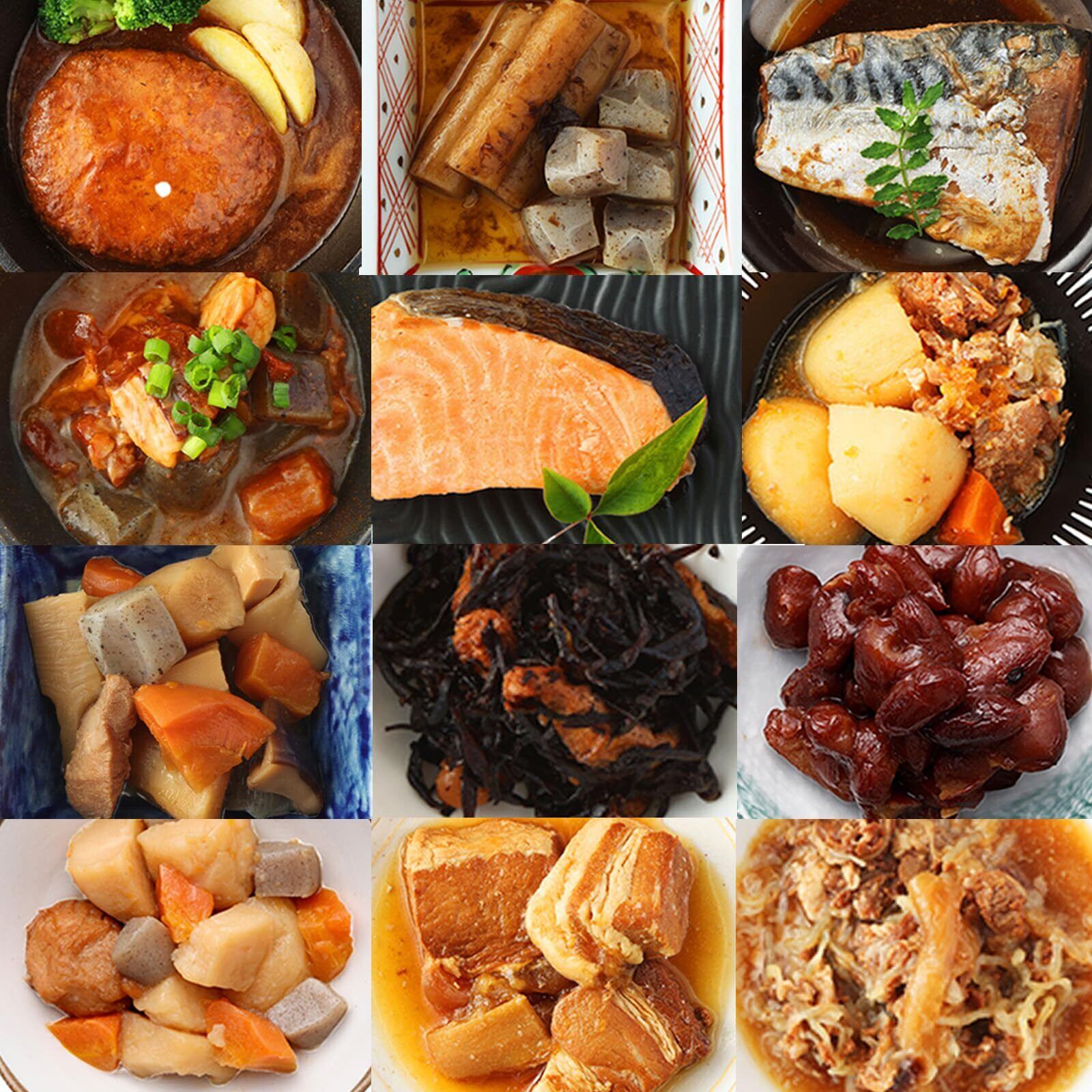 【内容量】12種類✕各1袋 国産牛のすじこん煮こみ、豚肉の角煮、オリジナルソースのハンバーグ(豆腐入り)、牛すきやき丼、鮭の塩焼き、さばの煮つけ、ごろっと野菜の筑前煮、肉じゃが、ひじきの五目煮、じゃがいも煮っころがし、ごぼうとこんにゃくのきんぴら風(ごま風味)、昔ながらの金時豆煮、