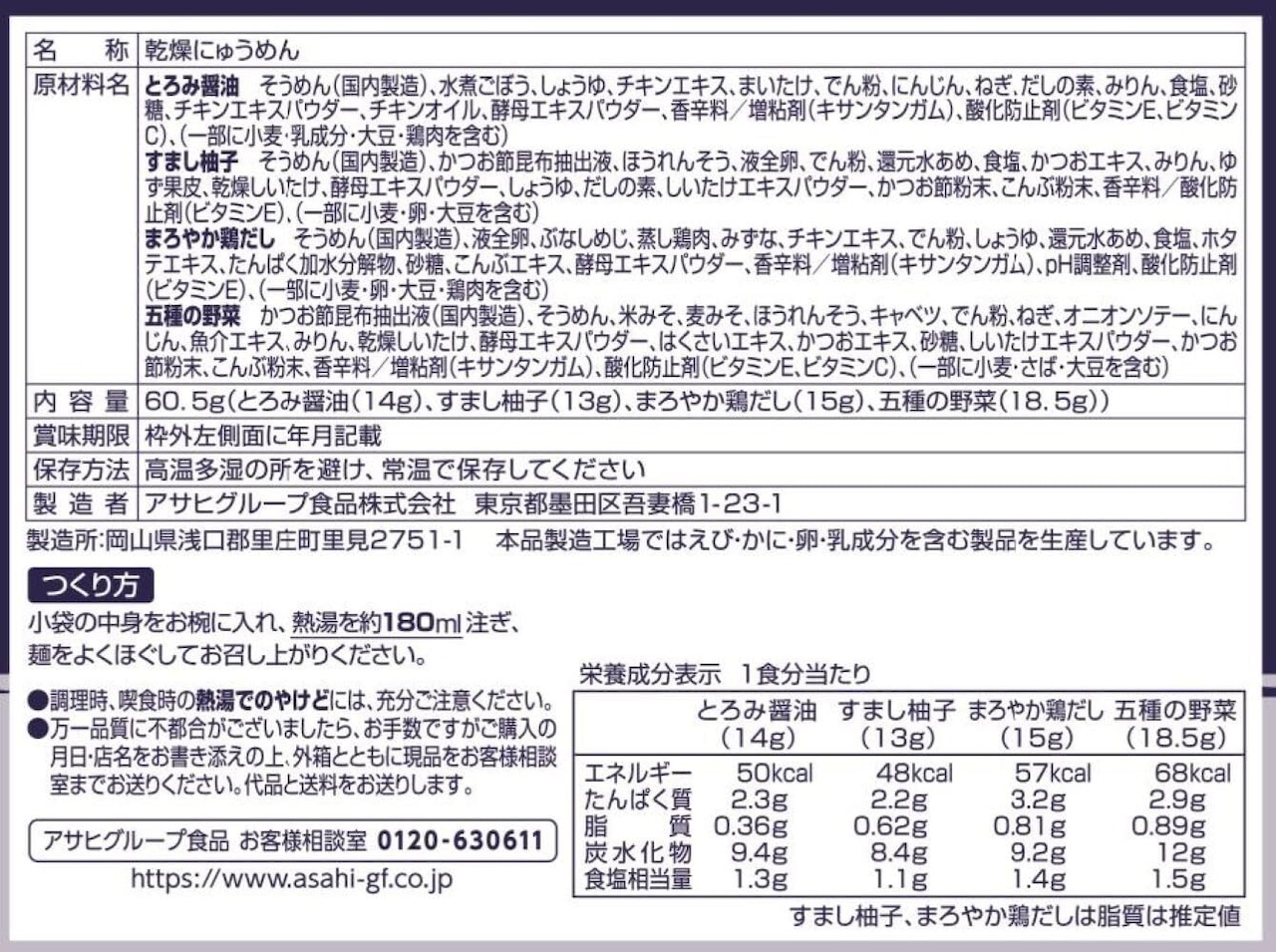 原材料:【にゅうめん まろやか鶏だし】そうめん(国内製造)、液全卵、ぶなしめじ、蒸し鶏肉、みずな、チキンエキス、でん粉、しょうゆ、還元水あめ、食塩、ホタテエキス、たんぱく加水分解物、砂糖、こんぶエキス、酵母エキスパウダー、香辛料/増粘剤(キサンタンガム)、pH調整剤、酸化防止剤(ビタミンE)、(一部に小麦・卵・大豆・鶏肉を含む) 【にゅうめん すまし柚子】そうめん(国内製造)、かつお節昆布抽出液、ほうれんそう、液全卵、でん粉、還元水あめ、食塩、かつおエキス、みりん、ゆず果皮、乾燥しいたけ、酵母エキスパウダー、しょうゆ、だしの素、しいたけエキスパウダー、かつお節粉末、こんぶ粉末、香辛料/酸化防止剤(ビタミンE)、(一部に小麦・卵・大豆を含む) 【にゅうめん とろみ醤油】そうめん(国内製造)、水煮ごぼう、しょうゆ、チキンエキス、まいたけ、でん粉、にんじん、ねぎ、だしの素、みりん、食塩、砂糖、チキンエキスパウダー、チキンオイル、酵母エキスパウダー、香辛料/増粘剤(キサンタンガム)、酸化防止剤(ビタミンE、ビタミンC)、(一部に小麦・乳成分・大豆・鶏肉を含む) 【にゅうめん 五種の野菜(あっさり味噌味)】かつお節昆布抽出液(国内製造)、そうめん、米みそ、麦みそ、ほうれんそう、キャベツ、でん粉、ねぎ、オニオンソテー、にんじん、魚介エキス、みりん、乾燥しいたけ、酵母エキスパウダー、はくさいエキス、かつおエキス、砂糖、しいたけエキスパウダー、かつお節粉末、こんぶ粉末、香辛料/増粘剤(キサンタンガム)、酸化防止剤(ビタミンE、ビタミンC)、(一部に小麦・さば・大豆を含む)