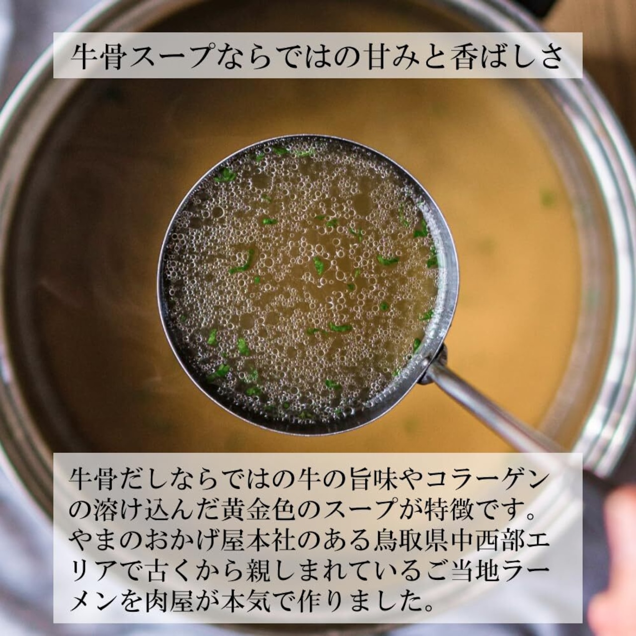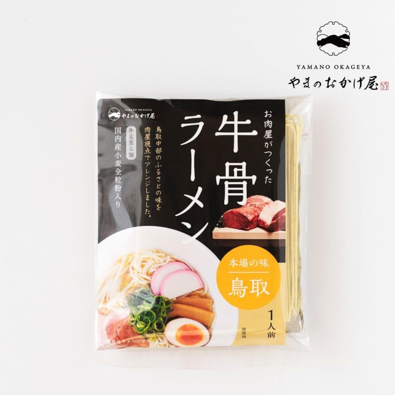 鳥取県の中西部エリアで古くから親しまれてきた、牛の骨で出汁を取った当地伝統のラーメン「牛骨ラーメン」を、やまのおかげ屋オリジナルのラーメンに仕上げました。スープ、この商品のために1から開発。肉屋がつくった、牛の旨味が際立つ完全オリジナル商品です。 また、乾麺は国内産小麦の全粒粉を使った、小麦の薫りが際立つ麺に仕上げました。牛骨スープの旨味に小麦の風味がマッチして、とても美味しくお召し上がりいただけます。