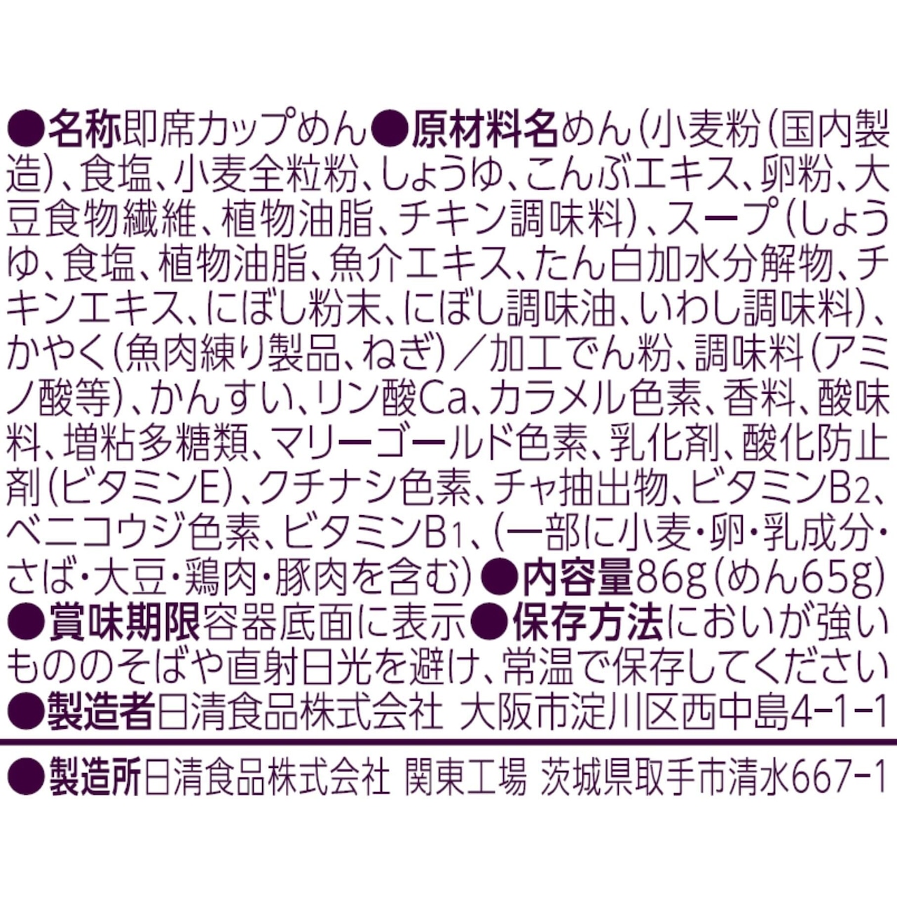 めん(小麦粉(国内製造)、食塩、小麦全粒粉、しょうゆ、こんぶエキス、卵粉、大豆食物繊維、植物油脂、チキン調味料)、スープ(しょうゆ、食塩、植物油脂、魚介エキス、たん白加水分解物、チキンエキス、にぼし粉末、にぼし調味油、いわし調味料)、かやく(魚肉練り製品、ねぎ)/加工でん粉、調味料(アミノ酸等)、かんすい、リン酸Ca、カラメル色素、香料、酸味料、増粘多糖類、マリーゴールド色素、乳化剤、酸化防止剤(ビタミンE)、クチナシ色素、チャ抽出物、ビタミンB2、ベニコウジ色素、ビタミンB1、(一部に小麦・卵・乳成分・さば・大豆・鶏肉・豚肉を含む)