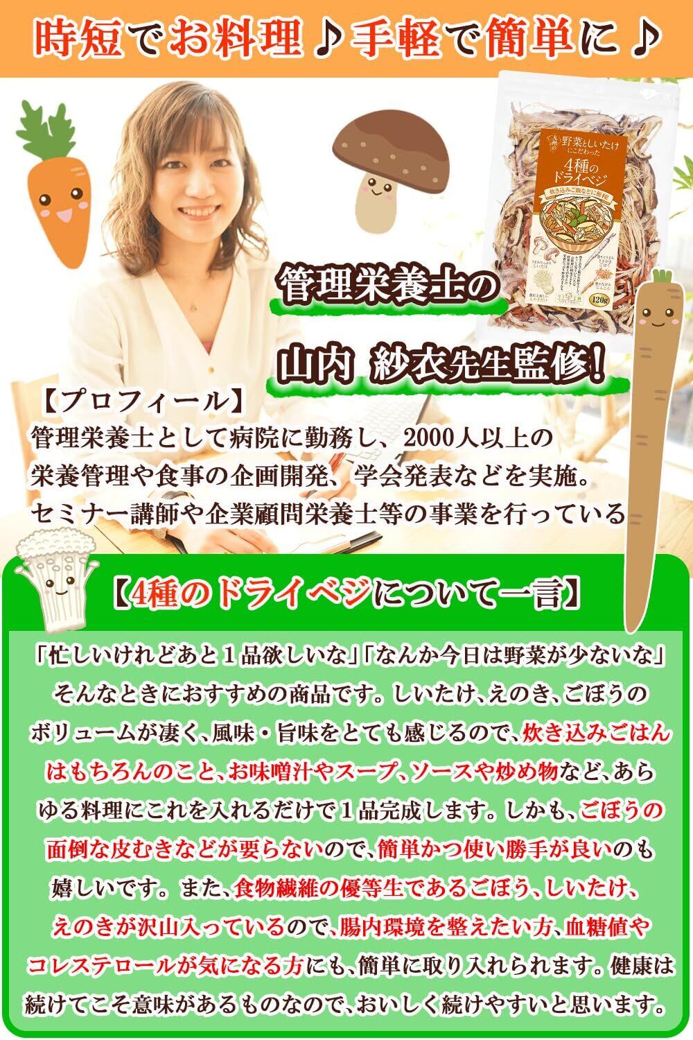 管理栄養士監修 国産 乾燥野菜 九州の野菜としいたけにこだわった 4種のドライベジ 120g×2袋セット 原木しいたけ えのきだけ ささがきごぼう 人参 保存食 カップ麺の具 味噌汁の具 野菜スープ エアーズドライ製法 フリーズドライ野菜 国産 乾燥野菜 九州産のみ使用 残留農薬検査実施済み