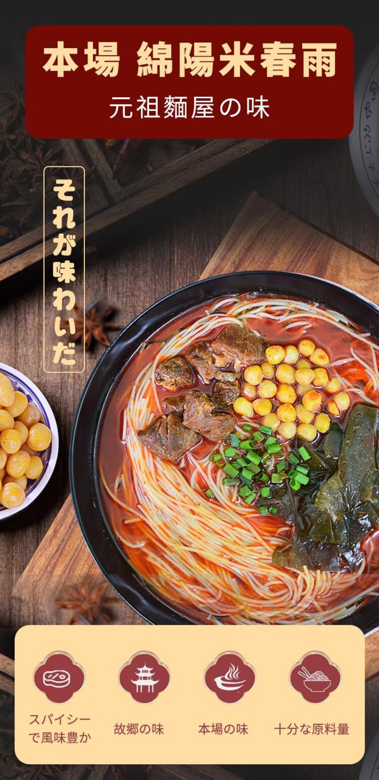 【本場の綿陽米春雨】当店の綿陽米春雨は、伝統的な職人技に忠実に作られ、綿陽の街や路地の本物の味を再現しています。一口食べれば、故郷の味、親しみのあるスパイシーな風味が広がり、たちまち子供の頃の思い出に引き戻されます。赤いスープの濃厚な味わいは、独特の綿陽の風味を感じさせてくれる。