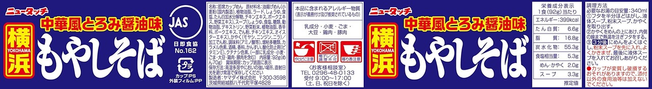 油揚げめん(小麦粉(国内製造)、植物油脂、ラード、しょうゆ、食塩、たん白加水分解物、チキンエキス、ポークエキス、野菜エキス)、スープ(しょうゆ、食塩、糖類、動物油脂、デキストリン、野菜粉末、植物油脂、香辛料、ポークエキス、でん粉、チキンエキス、オイスターエキス)、かやく(モヤシ、ニンジン、ニラ)/加工でん粉、調味料(アミノ酸等)、増粘多糖類、カラメル色素、酒精、香料、かんすい、酸化防止剤(ビタミンE)、クチナシ色素、(一部に乳成分・小麦・ごま・大豆・鶏肉・豚肉を含む)