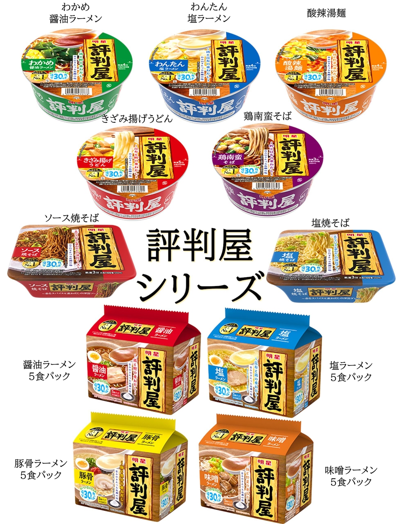 美味しく減塩できるお手軽価格の即席ラーメン。減塩訴求ブランド売上No.1(※1)!美味しく減塩できるお手軽価格の即席ラーメン「評判屋」。旨み引き立つ五島灘の塩に重ねだしで美味しさと減塩30%カット(※2)を実現してリニューアル。食べやすくつるみのあるフライ麺と、鶏と昆布のだしをベースに旨みを掛け合わせた塩スープ。麺は食べやすくつるみのあるフライ麺。スープは旨み引き立つ五島灘の塩を配合。鶏ガラベースに昆布のだしを重ね香味野菜を合わせた優しい味わい。※1:インテージSRI+即席めん(袋麺・カップ麺)市場 2020年1月~2023年12月累計販売金額※2:日本食品標準成分表2020年版(八訂)即席中華めん 油揚げ 乾(添付調味料等を含むもの)(100g当たり)と比較