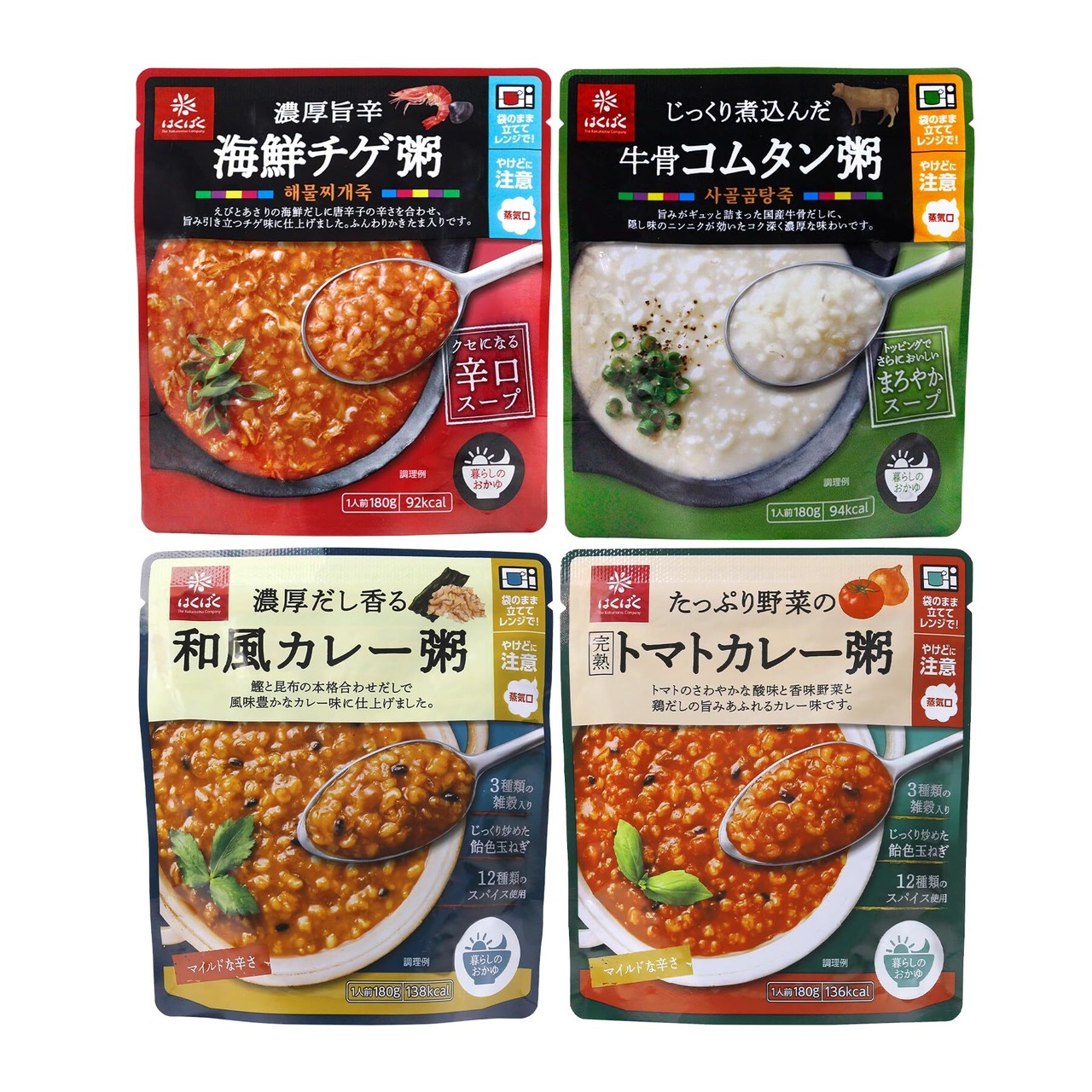 はくばく「グルメなおかゆ」シリーズの4種アソートです。濃厚旨辛海鮮チゲ粥、じっくり煮込んだ牛骨コムタン粥、濃厚だし香る和風カレー粥、たっぷり野菜の完熟トマトカレー粥が1袋ずつ入っています。袋のまま電子レンジで温めて食べられるので、忙しいときの食事にぴったり!温めずにそのままでも美味しく召し上がれますので、常備食としてもご活用ください。