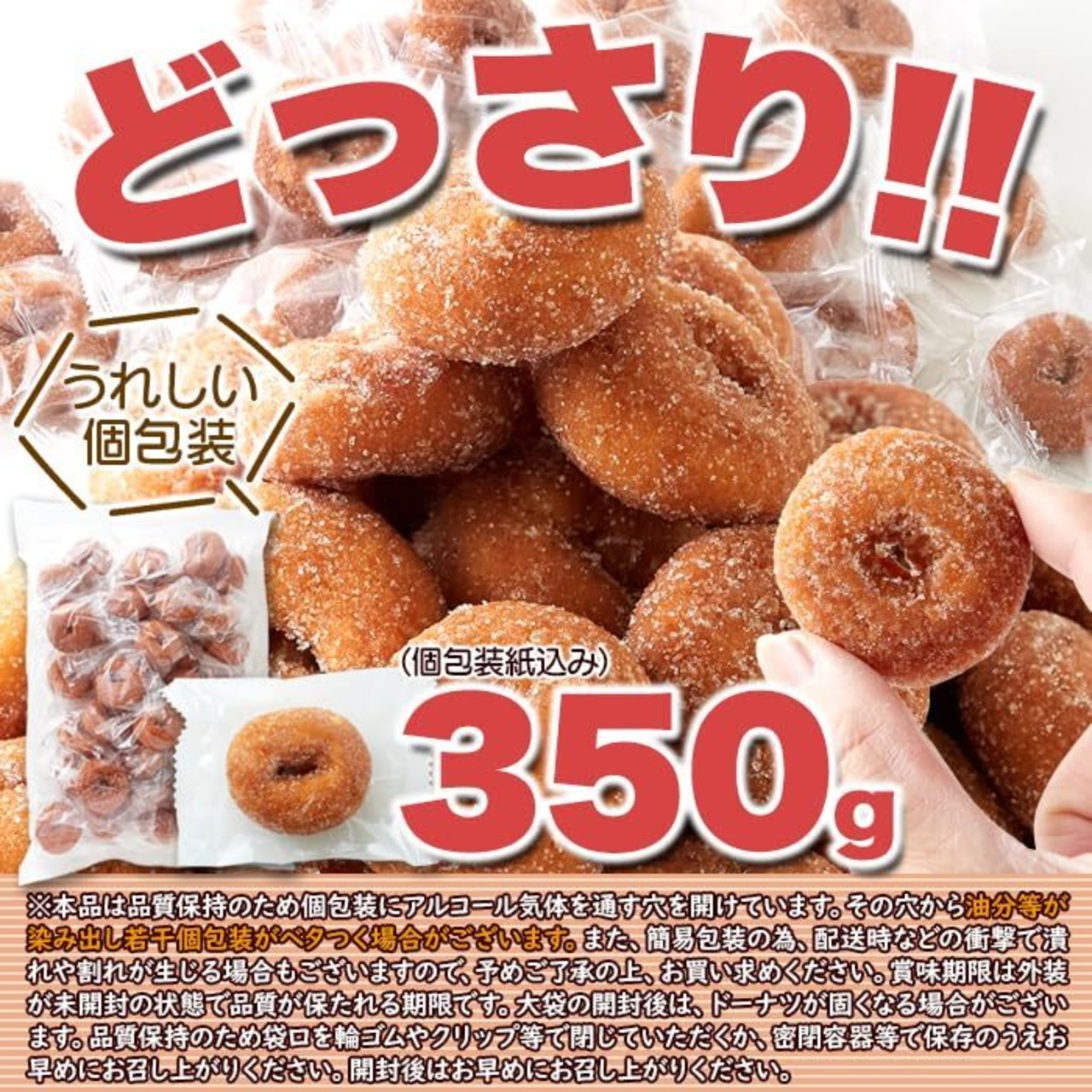 ■商品名:無地350gミニドーナツ ■名称:ドーナツ ■原材料名:小麦粉(国内製造)、砂糖、卵、植物油脂、マーガリン(乳成分を含む)、水飴、蜂蜜、ぶどう糖、食塩/ソルビット、膨脹剤、加工でんぷん、香料、乳化剤(大豆由来)、着色料(カロテン) ■内容量:350g(個包装込) ■賞味期限:製造より常温60日 ■保存方法:直射日光、高温多湿を避けてください。 ●この商品は品質保持のため、個包装にアルコール気体を通す穴をあけています。 ●開封後は賞味期限にかかわらず、お早めにお召しあがり下さい。