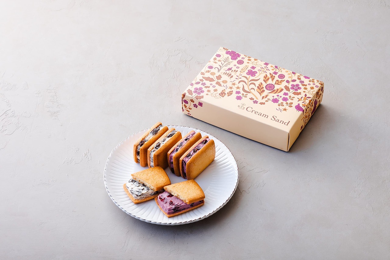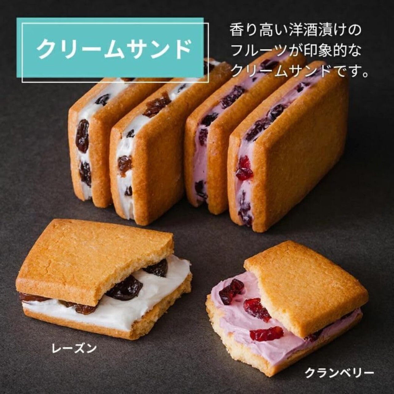 ラム酒に溶け込んだ風味豊かなレーズン入りのクリームと、洋酒に漬け込んだ爽やかな甘酸っぱさのクランベリー入りクリームを香ばしく焼き上げたクッキーでサンドした、2種類のクリームサンドの詰め合わせです。