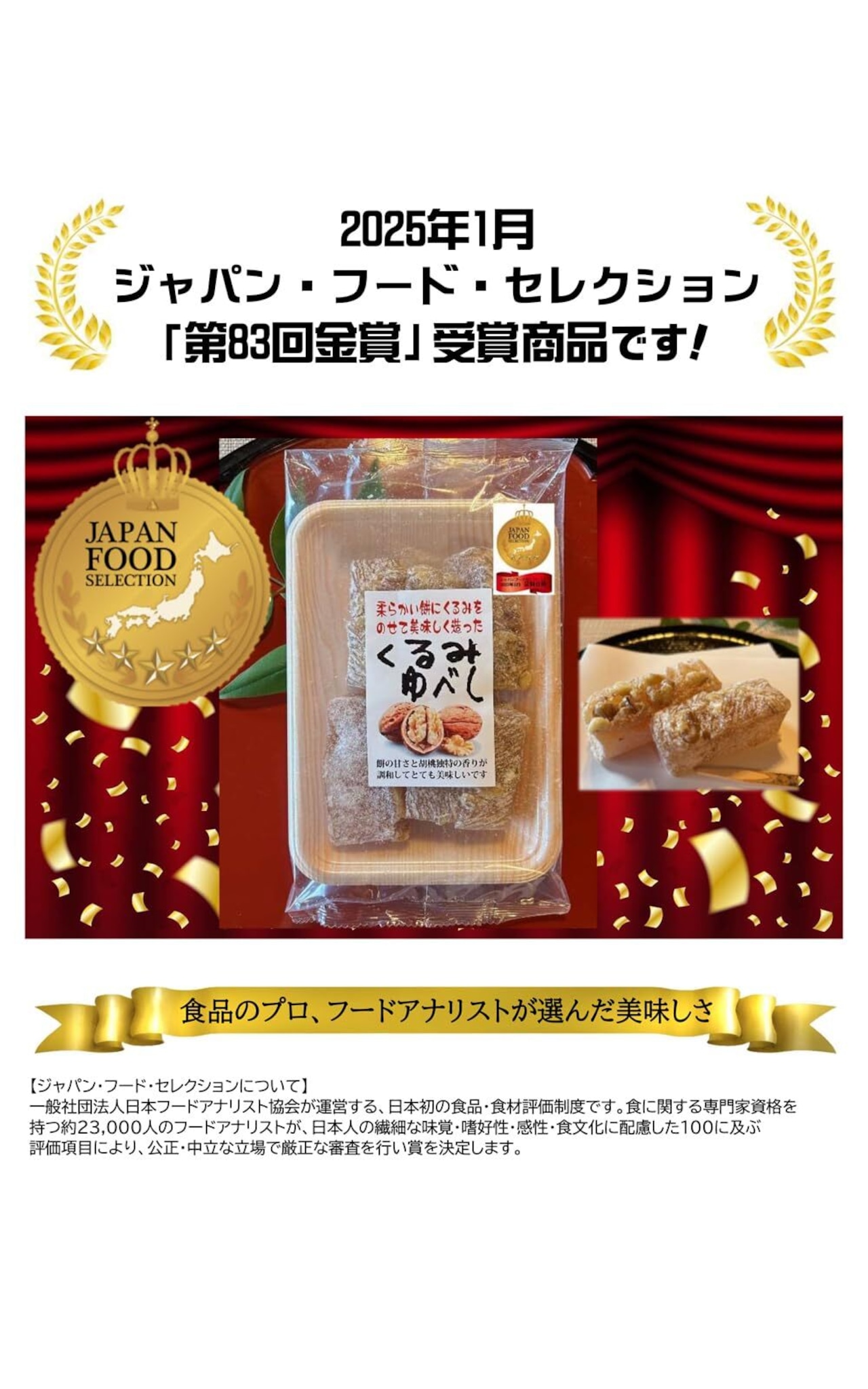 【審査員も絶賛 評価されたポイント】 ・柔らかい餅とくるみの軽快な食感の相性が良く素晴らしい ・とてもやさしい甘さとシンプルな味で飽きなくて良い ・オブラートの粉がキラキラしていて見た目が美しい ・保存料、着色料、香料不使用で安心感がある ・パッケージから取り出すときにくっつかない工夫は素晴らしい ・お抹茶は勿論、コーヒー、紅茶、マテ茶などにも合いそう ・パッケージの文字の雰囲気とくるみの画像が優しい印象 きなこ餅や信玄餅などの色々なお菓子がある中で以上の点で高い評価を頂き、ジャパンフードセレクション2025年1、金賞受賞となりました。