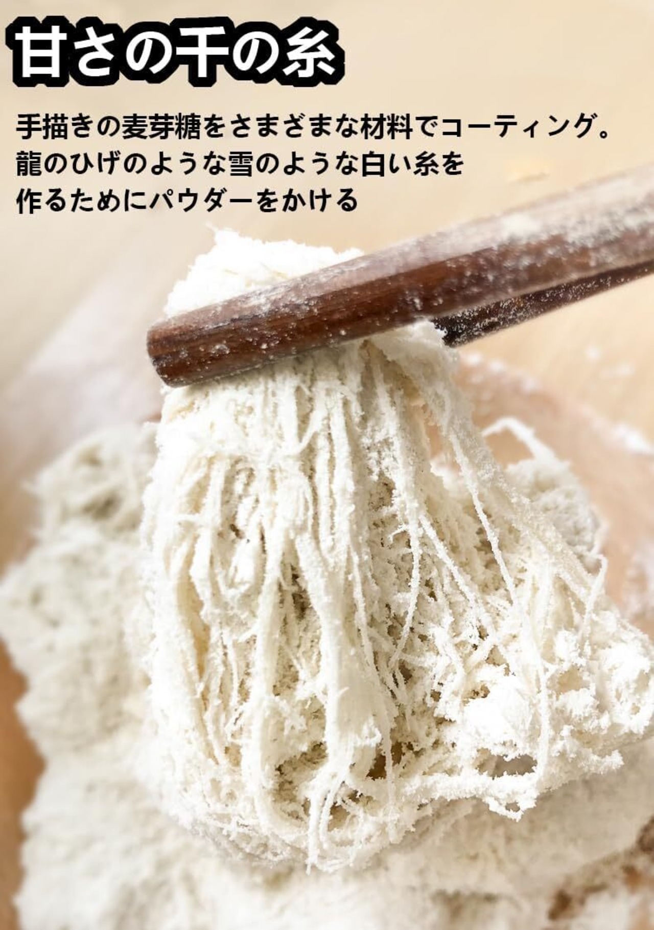 【外観】龍鬚酥は伝統的な中華菓子で、通常クリーム色の白色で、外層はパリパリしており、各層は龍の髭のように軽くてふわふわしている。絹糸のような繊細さ、透明な層、ふわふわとした口当たり、甘い後味が特徴。