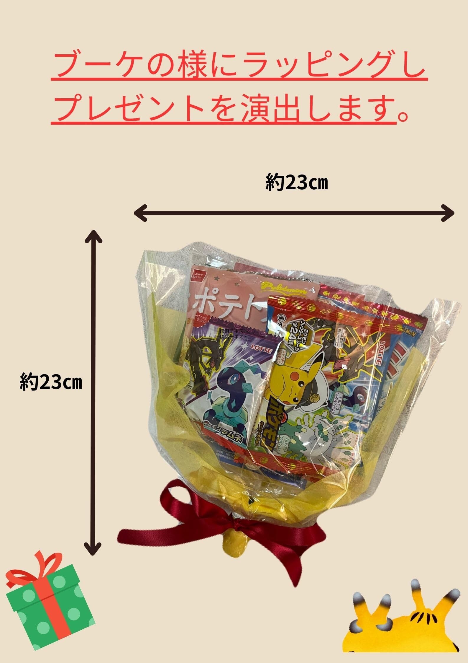 お菓子を詰め合わせブーケ(花束)の様にラッピングしてあり、このままプレゼントとして渡せます。お子さん、お孫さんのお祝い事や、地域のイベントなどに渡すと喜ばれます。