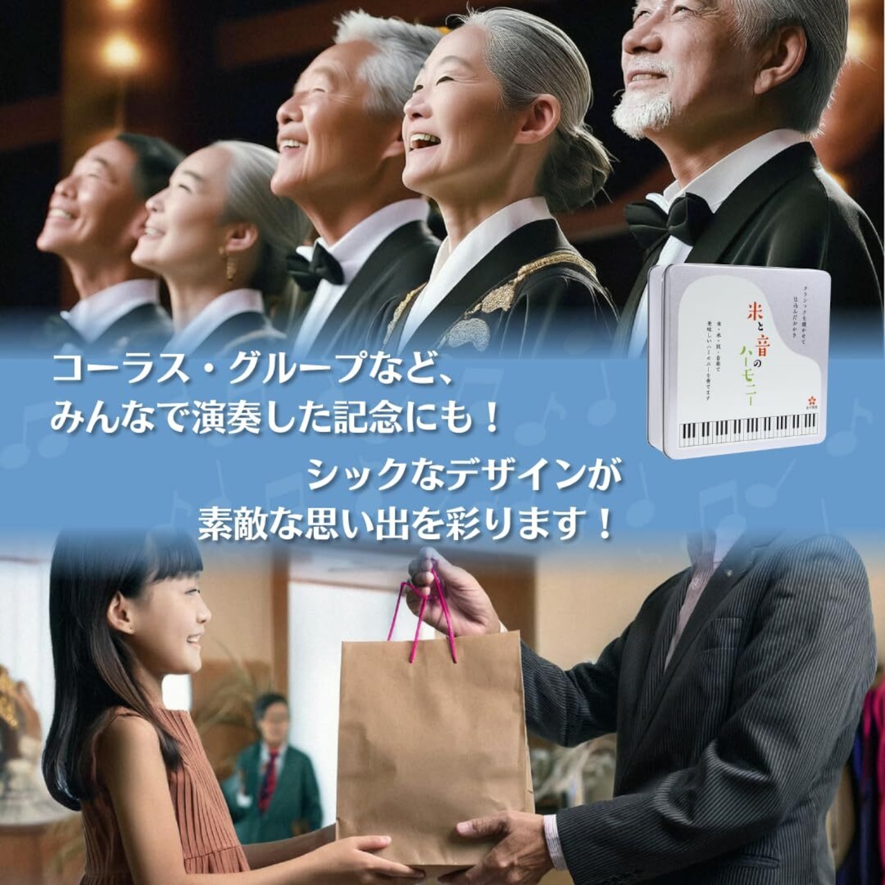 「米と音のハーモニー – 音楽会等のイベントの特別な贈り物や仲間内の記念に」 クラシック音楽を聞かせて仕込んだ特別な味わいのおかきで、発表会の記念品に最適 音楽教室の先生やお母さんたちに喜ばれる、上品でおしゃれなピアノ缶入り 包装で配りやすく、塩味と醤油味の2種類を楽しめる、140gの贅沢なボリューム 美味しくてかわいいお菓子は、音楽をやっている子供へのギフトとしても喜ばれます