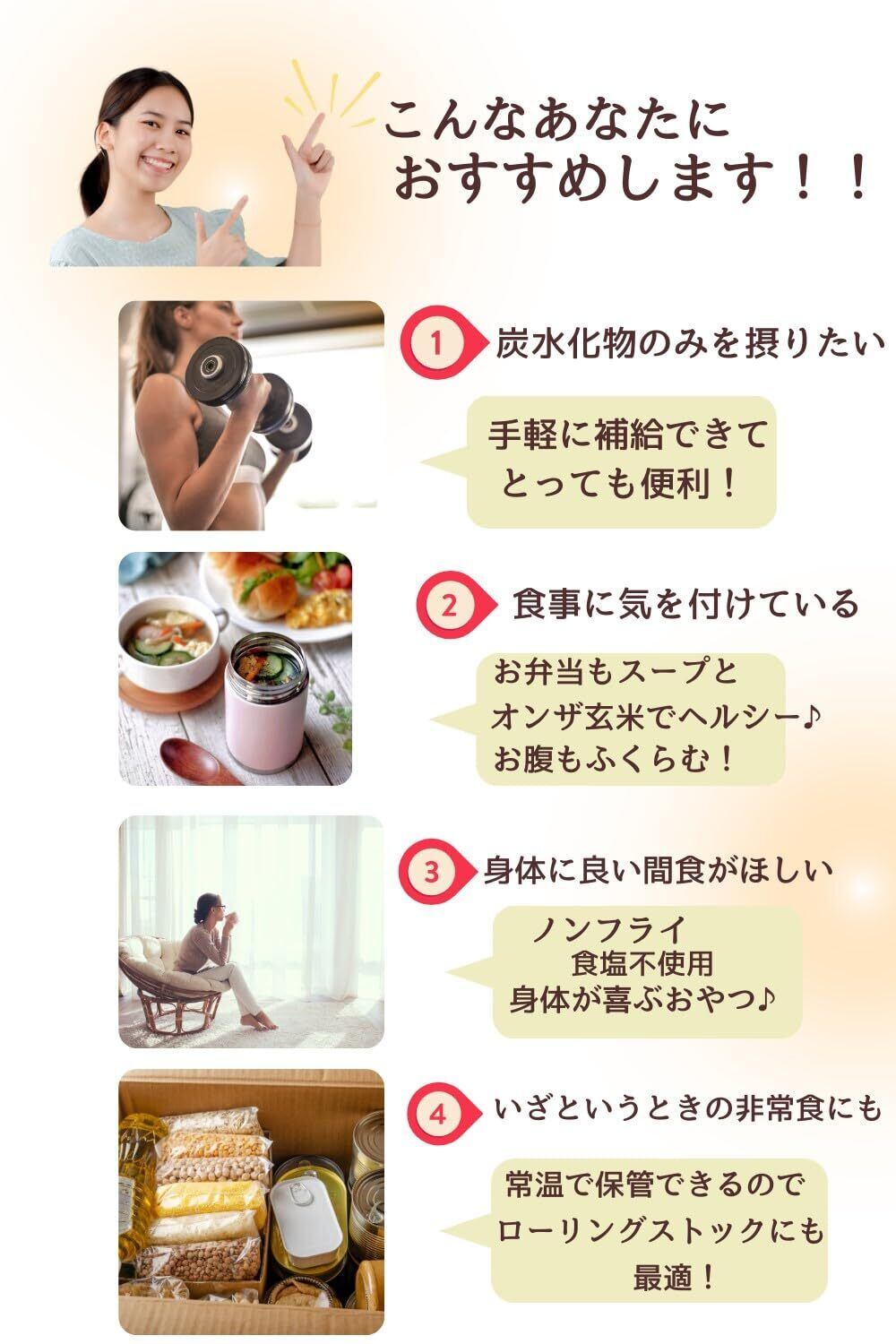 【玄米をそのまま手間なし】浸水する手間なく、簡単に栄養が取れます。お湯にふやかせば、離乳食や介護食になり、炭水化物のみを取りたいトレーニーやヴィーガン・ベジタリアンにも人気の「ライスケーキ」。また、災害時の非常食にもなります。