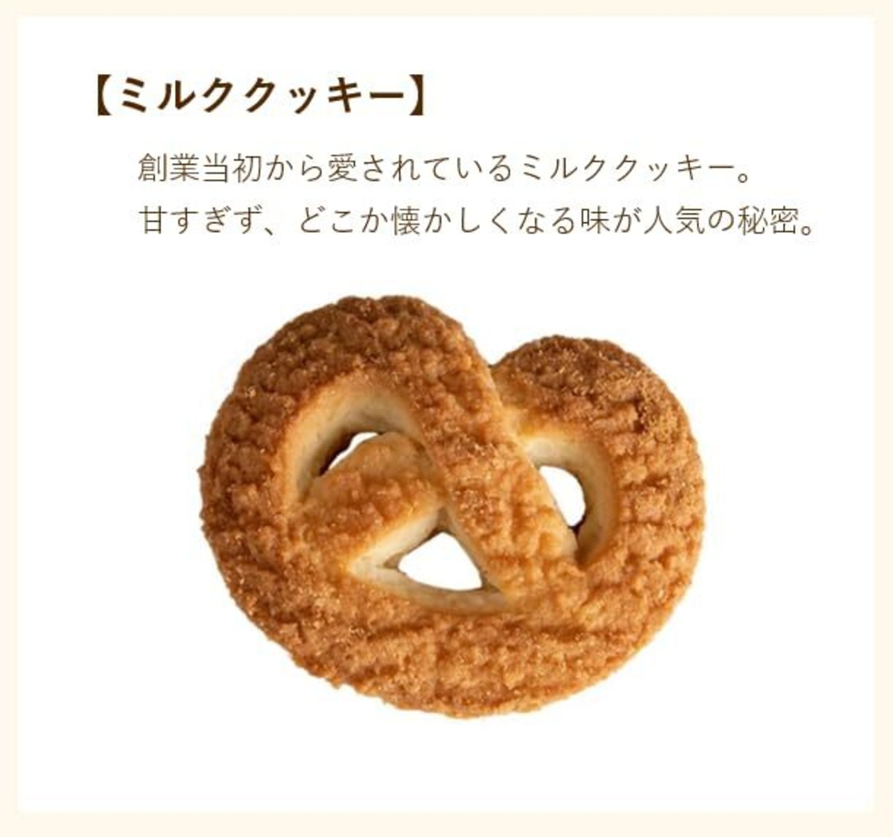 【ミルククッキー】創業当初から愛されているミルククッキー。甘すぎず、どこか懐かしくなる味が人気の秘密。【チョコチップクッキー】小粒のチョコチップがたくさん。もうひとつ、あともうひとつと手を伸ばしたくなる味。【メープルクッキー】カナダ産のメープルシロップの豊かな香りが、お口に広がります。【ショコラクッキー】ガーナ産のココアを使用した甘さ控えめでコーヒーのお供にぴったりのお味です。