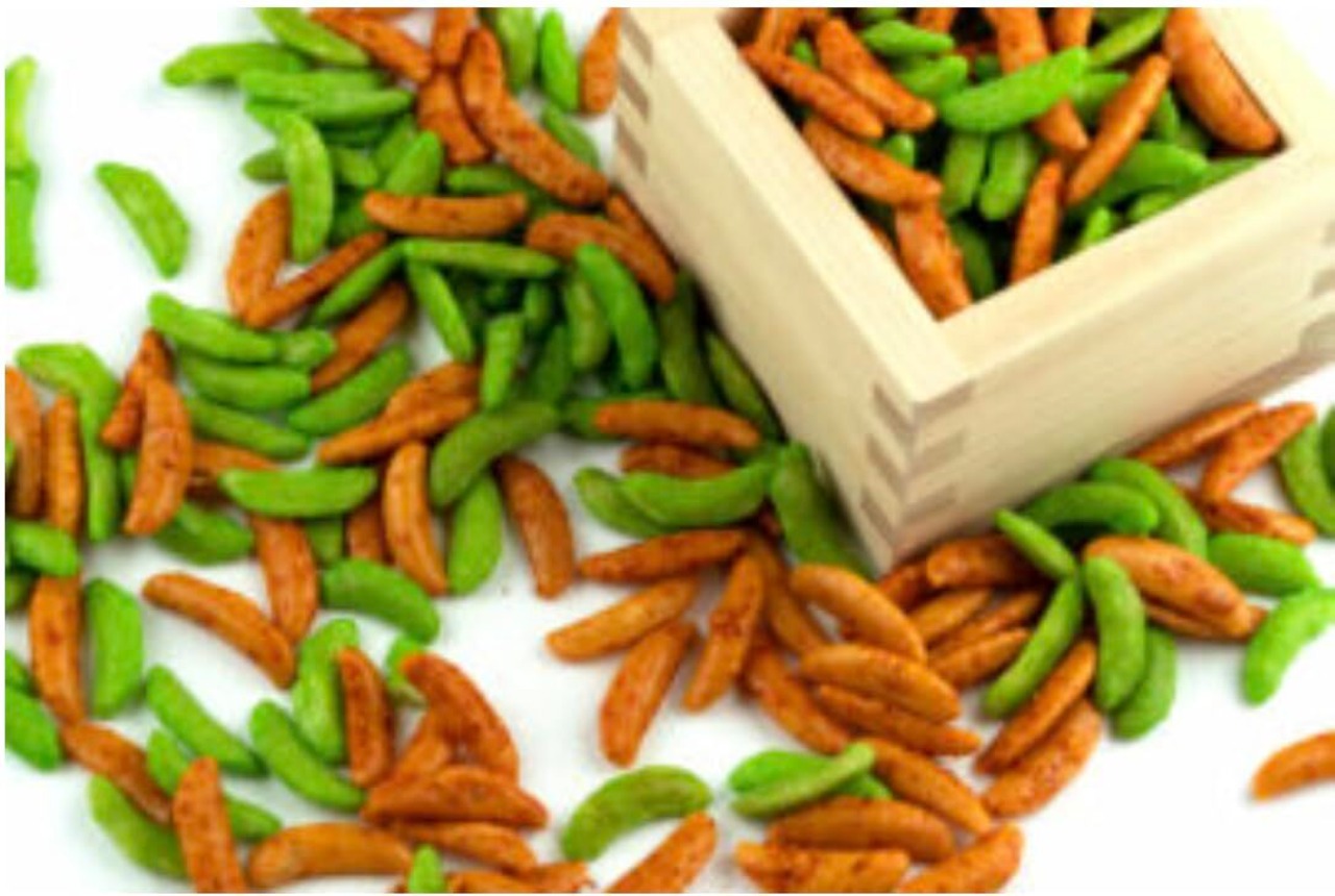 【唐辛子】でん粉、うるち米(国産)、唐辛子、醤油、砂糖、デキストリン、食塩、ガーリックパウダー、発酵調味料、かつおエキス、植物油脂、加工デンプン、調味料(アミノ酸等)、パプリカ色素、香辛料抽出物、(原材料の一部に小麦、大豆を含む)【わさび】もち米(タイ産)、ワサビパウダー、醤油、砂糖、マルトデキストリン、ぶどう糖、加工でん粉、着色料(青1、黃4)、調味料(核酸)、(原材料の一部に大豆、小麦を含む)