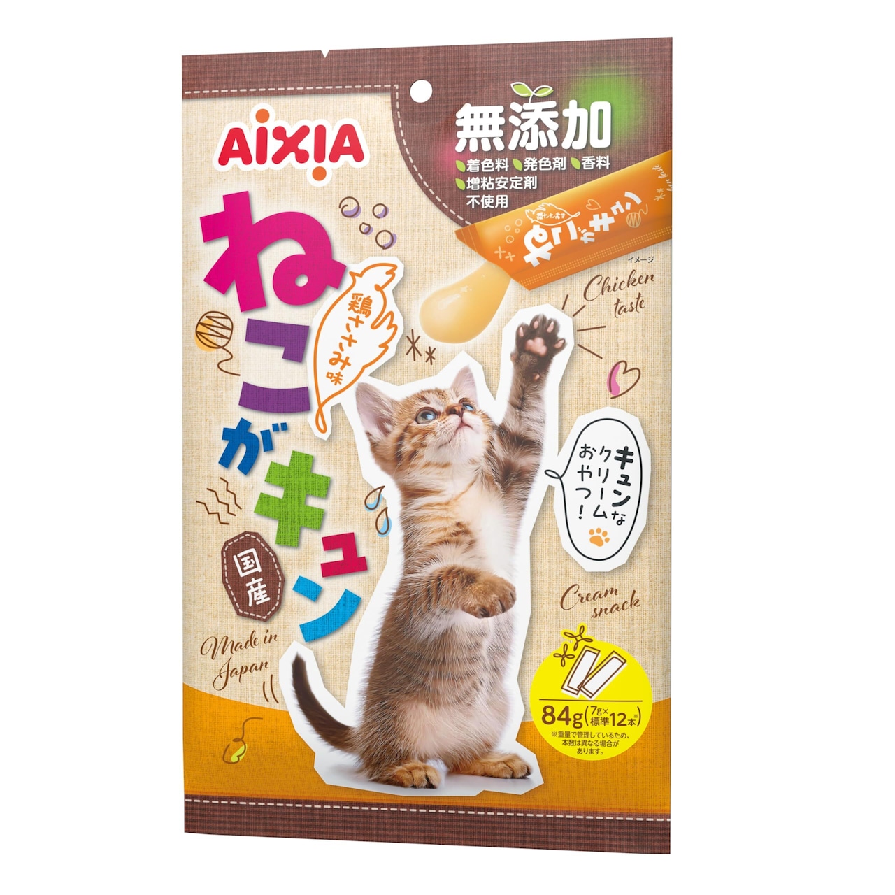 鶏肉をベースにクリーム状に仕立てたスティックタイプのおやつ。スティックからそのまま与えても、フードのトッピングとしても。着色料・発色剤・香料・増粘安定剤無添加。国産品。