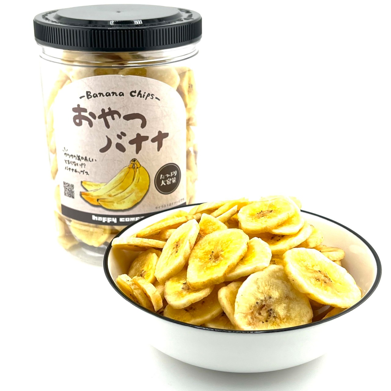商品名:おやつバナナ 名称:バナナチプ 原材料名:バナナ、ココナッツオイル、砂糖/香料 内容量:250g 賞味期限:パッケージに記載 保存方法:直射日光・高温多湿をお避け保存してください 栄養成分表示(100gあたり) (推定値) ・エネルギー:533kcal ・たんぱく質:3.3g ・ 脂質:30.0g ・ 炭水化物:63.3g ・食塩相当量:0g