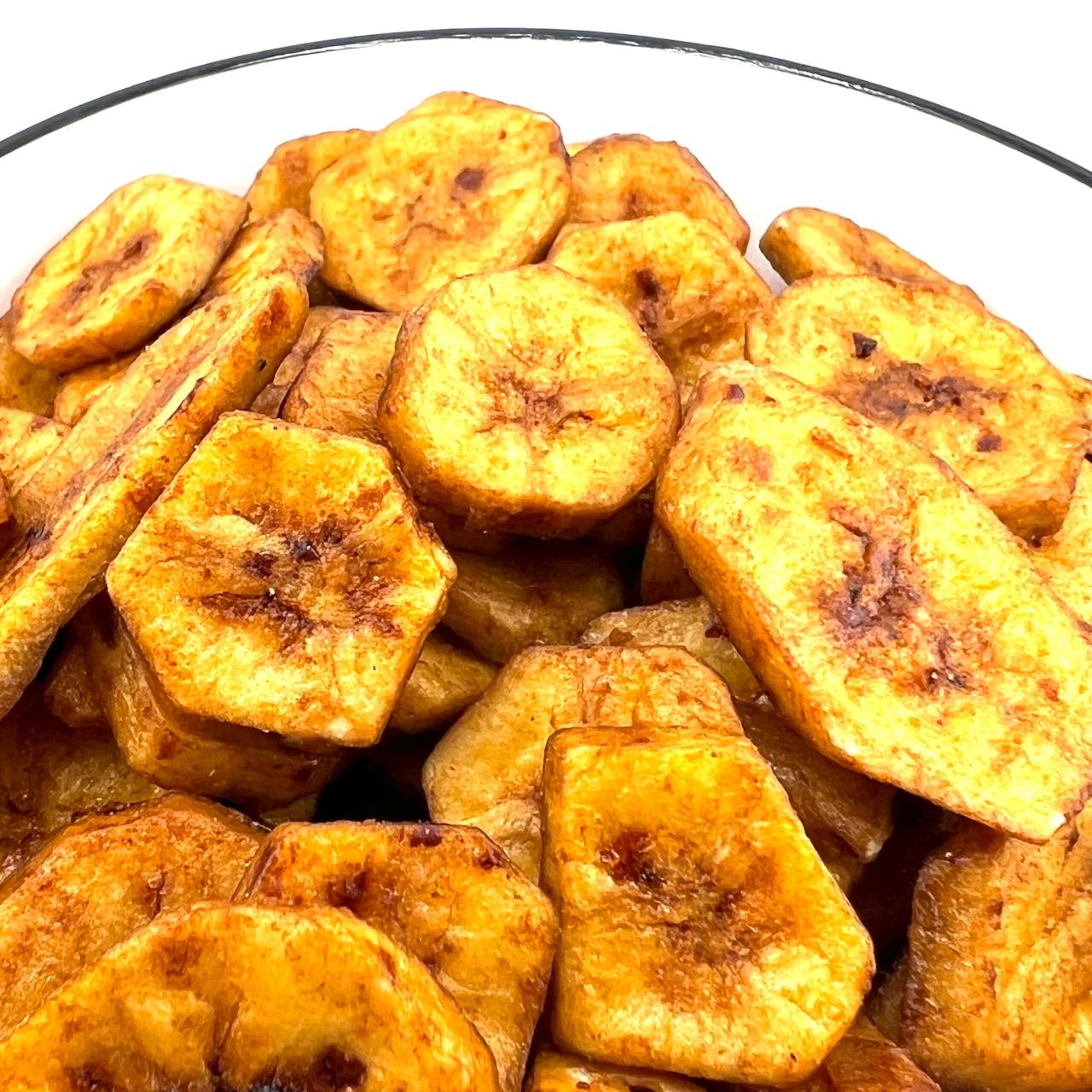 一度揚げた後にバナナに糖蜜を絡ませ、再度揚げる事により表面にキレイな艶ができこれが独特なサクサク食感につながっています。
