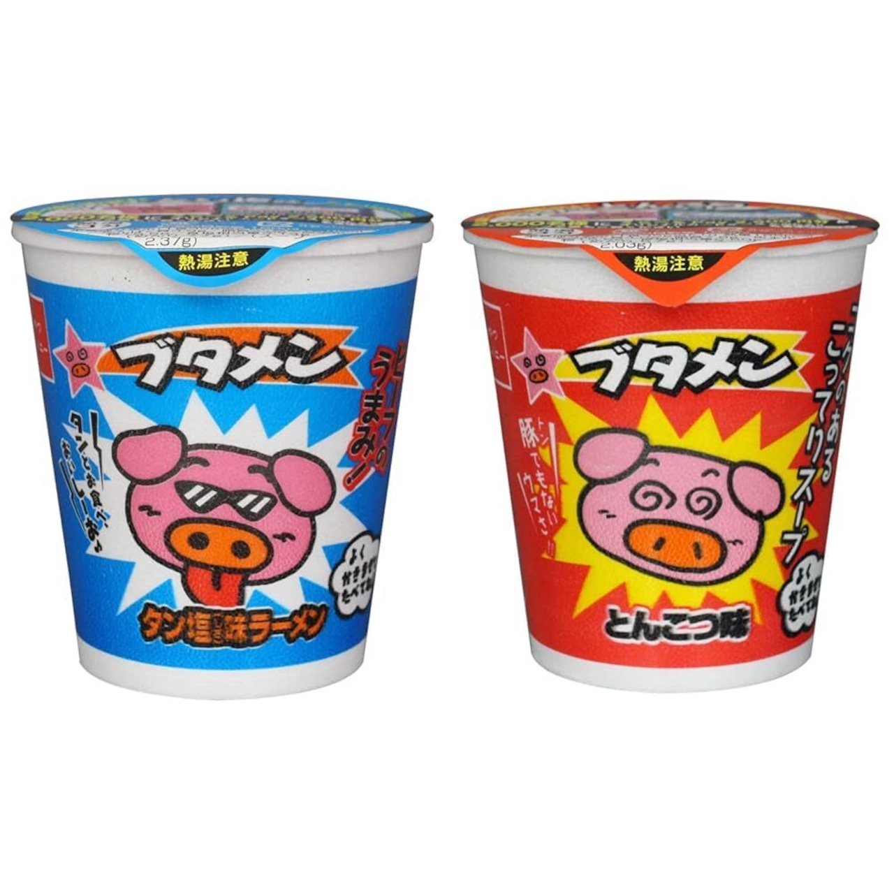 定番のミニカップラーメン、ブタメンとんこつ味。ブタメンは1993年に初めて発売されました。こだわりのこってり豚骨スープが食欲をそそります。少し小腹がすいたときに、おやつや夜食に、ランチのおともに、ぴったりなミニサイズ。お子様からおとなの方まで幅広く召し上がっていただけます。