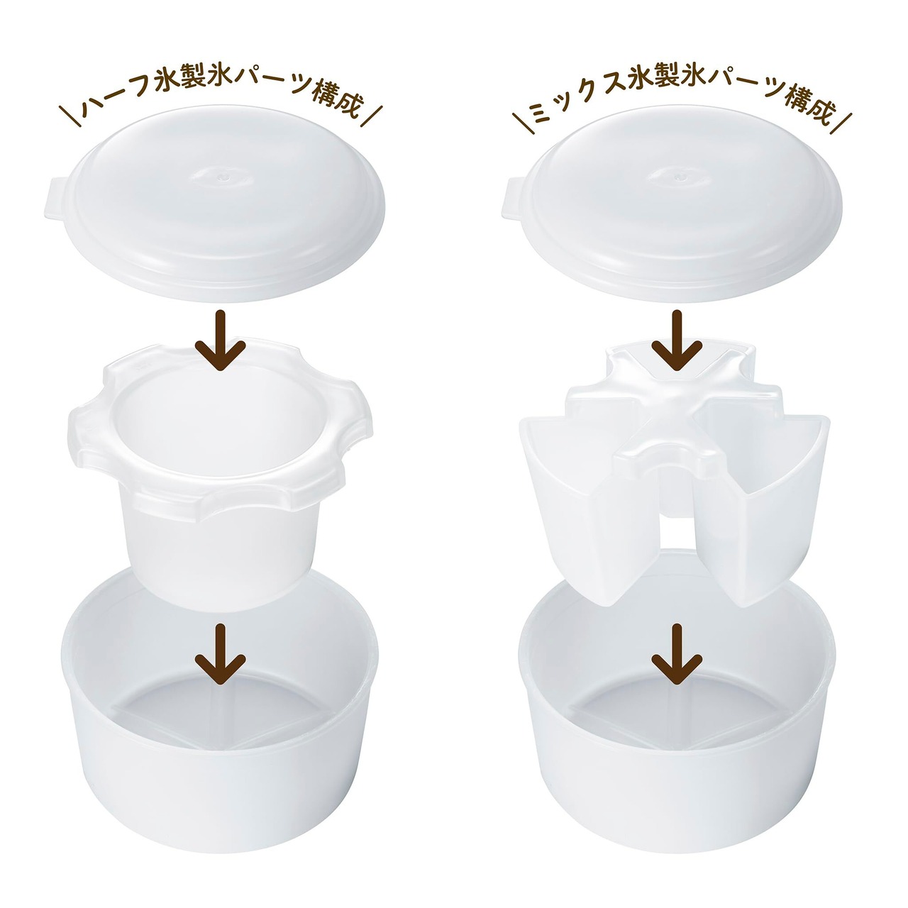 【製氷パーツが付属】 2色のハーフ氷やミックス氷など、ビジュアル映えするかき氷が作れちゃう ミックス氷はアイデア次第で最大4色のかき氷を作ることができます。 専用製氷カップが付属するのに加えて、ご家庭の冷凍庫で作ったバラ氷にも対応しています。