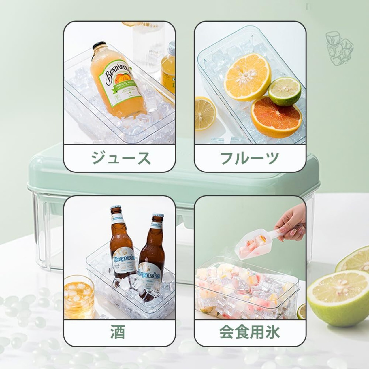 【衛生的な密閉設計】蓋つきでほこりや異物をシャットアウトし、清潔さを保ちます。冷蔵庫内の匂いが侵入するのを防ぎ、常に新鮮な氷を提供します。また、付属のスコップで手を清潔に保ちながら氷を取り出せます。