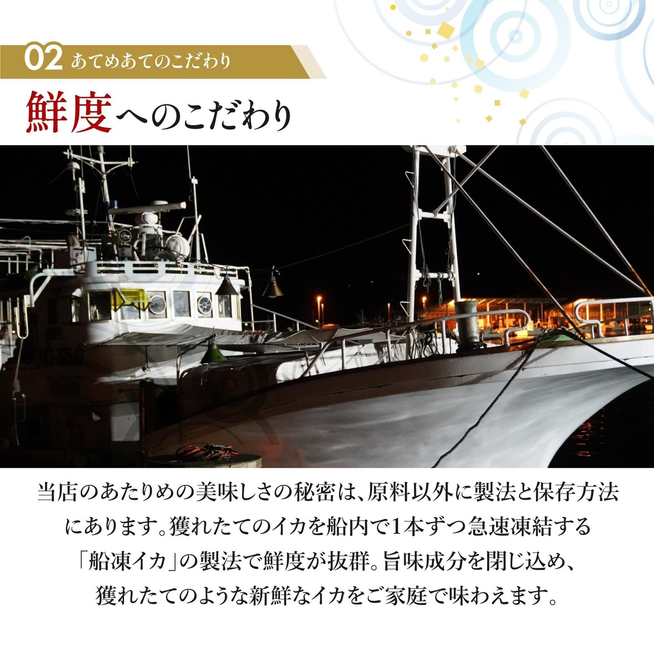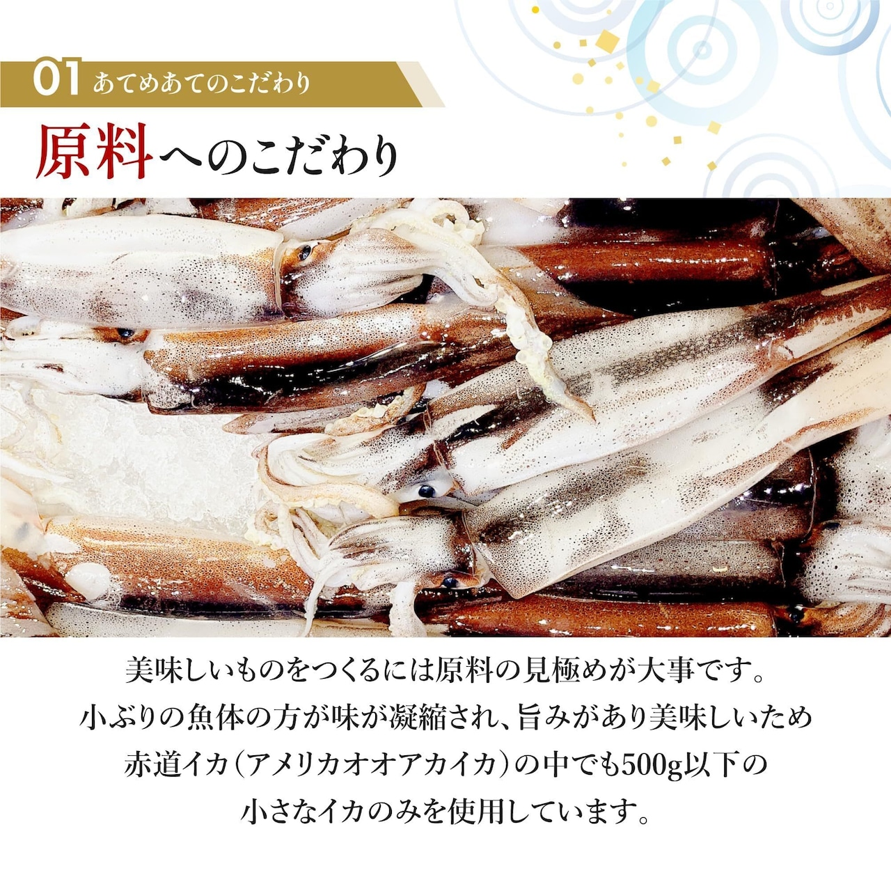 【完全無添加の逸品】原料はいかと塩のみ。他に一切の添加物を使用していない完全無添加のあたりめ。シンプルが故に原料いかによって味が左右される為、原料選びには特に時間をかけて選定しています。