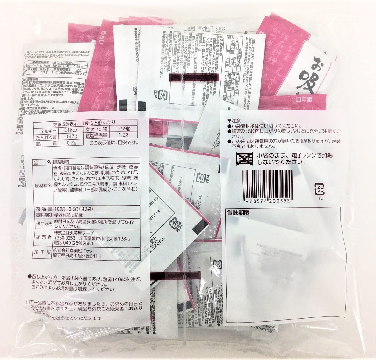 お椀にいれて、お湯をそそぐだけで、たちまちかつお風味の豊な香りがひろがるお吸いもの。だしの上品な味わいが楽しめるシンプルな味付です。具材は、わかめ・ごま・ねぎを使用。普段の食事はもちろん、お弁当にも最適です。朝の忙しい時、ちょっと一息などにいかがでしょうか。ストックに便利な40袋入タイプです。