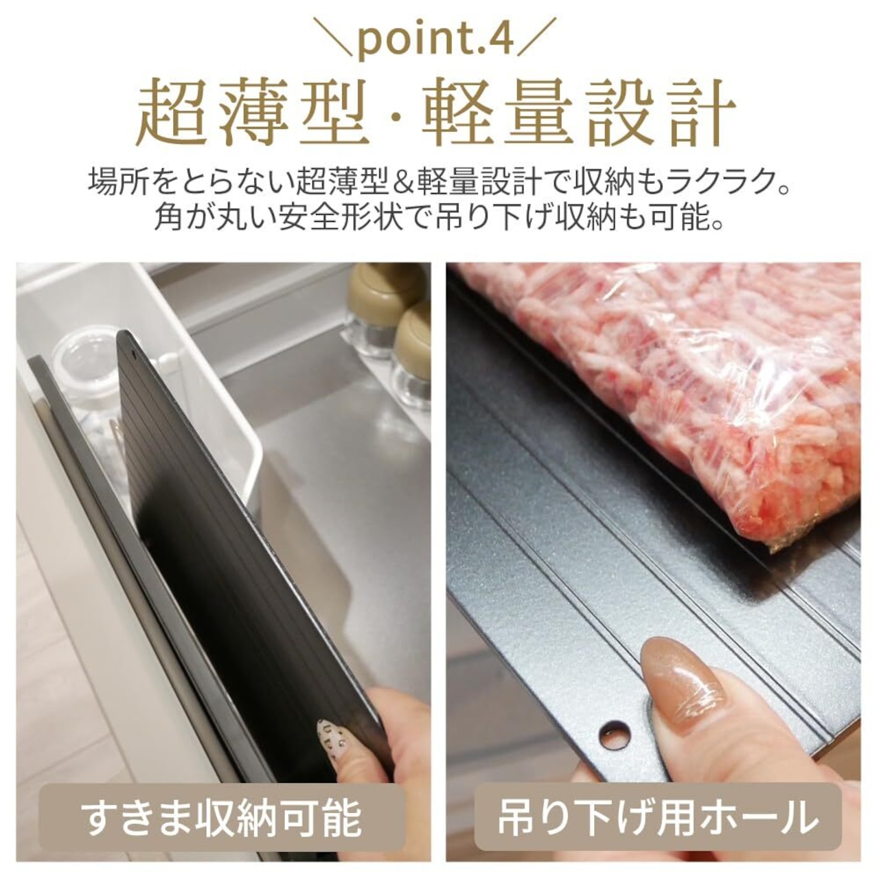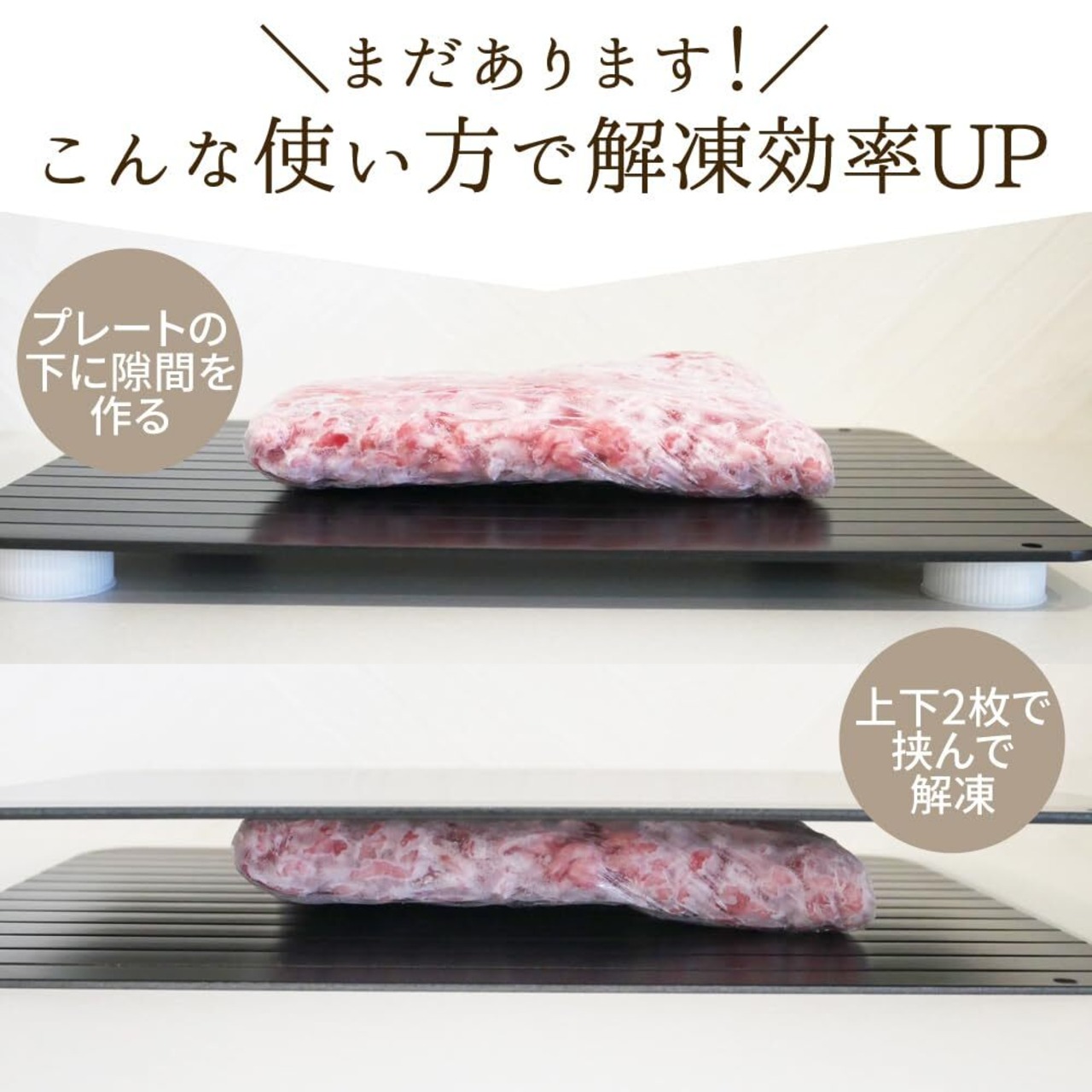 【置くだけで解凍美!解凍時間でお困りのあなたに 】 熱伝導率の高いアルミ合金製を採用!さらに底面は凹凸にし空気や水に触れる面積が増え、 効率よく冷気を吸収・放出し、急速解凍することができます