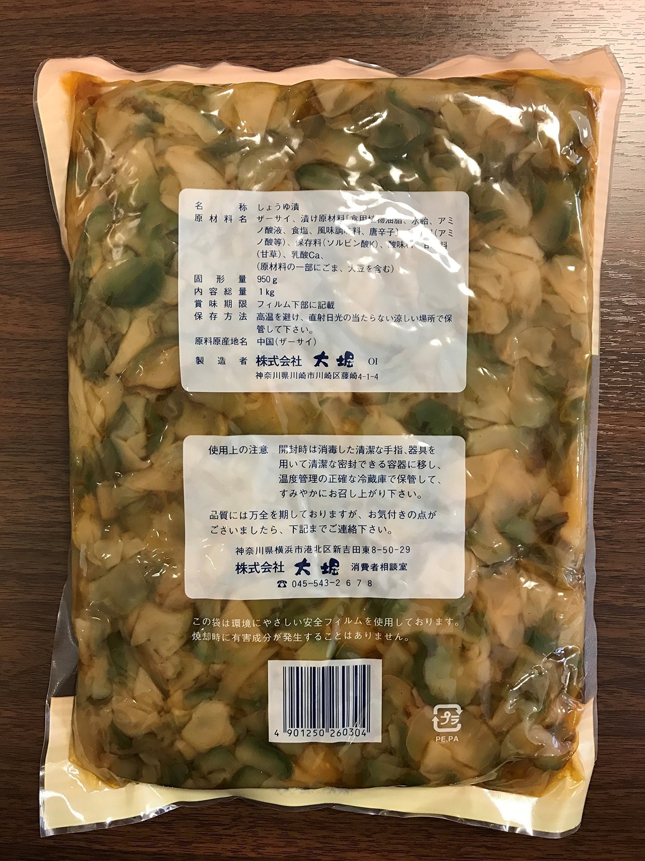 原材料名:ザーサイ、漬け原材料〔食用植物油脂、水飴、アミノ酸液、食塩、風味調味料、唐辛子〕、調味料(アミノ酸等)、保存料(ソルビン酸K)、酸味料、甘味料(甘草)、乳酸Ca、(原材料hの一部にごま、大豆を含む)