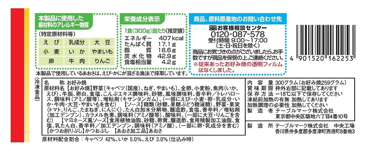 【お好み焼】野菜〔キャベツ(国産)、やまいも〕、全卵、小麦粉、豚肉、牛脂、紅しょうが、揚げ玉、食塩、かつおエキス調味料、砂糖、ポークエキス、香味油脂、香辛料/トレハロース、調味料(アミノ酸等)、増粘多糖類、加工デンプン、酸味料、着色料(紅麹)、膨張剤、(一部に小麦・卵・牛肉・大豆・豚肉・やまいもを含む) 【ソース】糖類(砂糖、果糖ぶどう糖液糖)、野菜・果実(トマト、りんご、たまねぎ、にんにく)、たん白加水分解物、醸造酢、食塩、香辛料/増粘剤(加工デンプン)、カラメル色素、調味料(アミノ酸等)、酸味料、(一部に大豆・りんごを含む)【マヨネーズ風ソース】食用植物油脂、砂糖、卵黄、醸造酢、食用精製加工油脂、食塩、乳たん白、香辛料/加工デンプン、調味料(アミノ酸)、(一部に卵・乳成分を含む) 【かつお削りぶし】かつおぶし 【あおさ加工品】あおさ