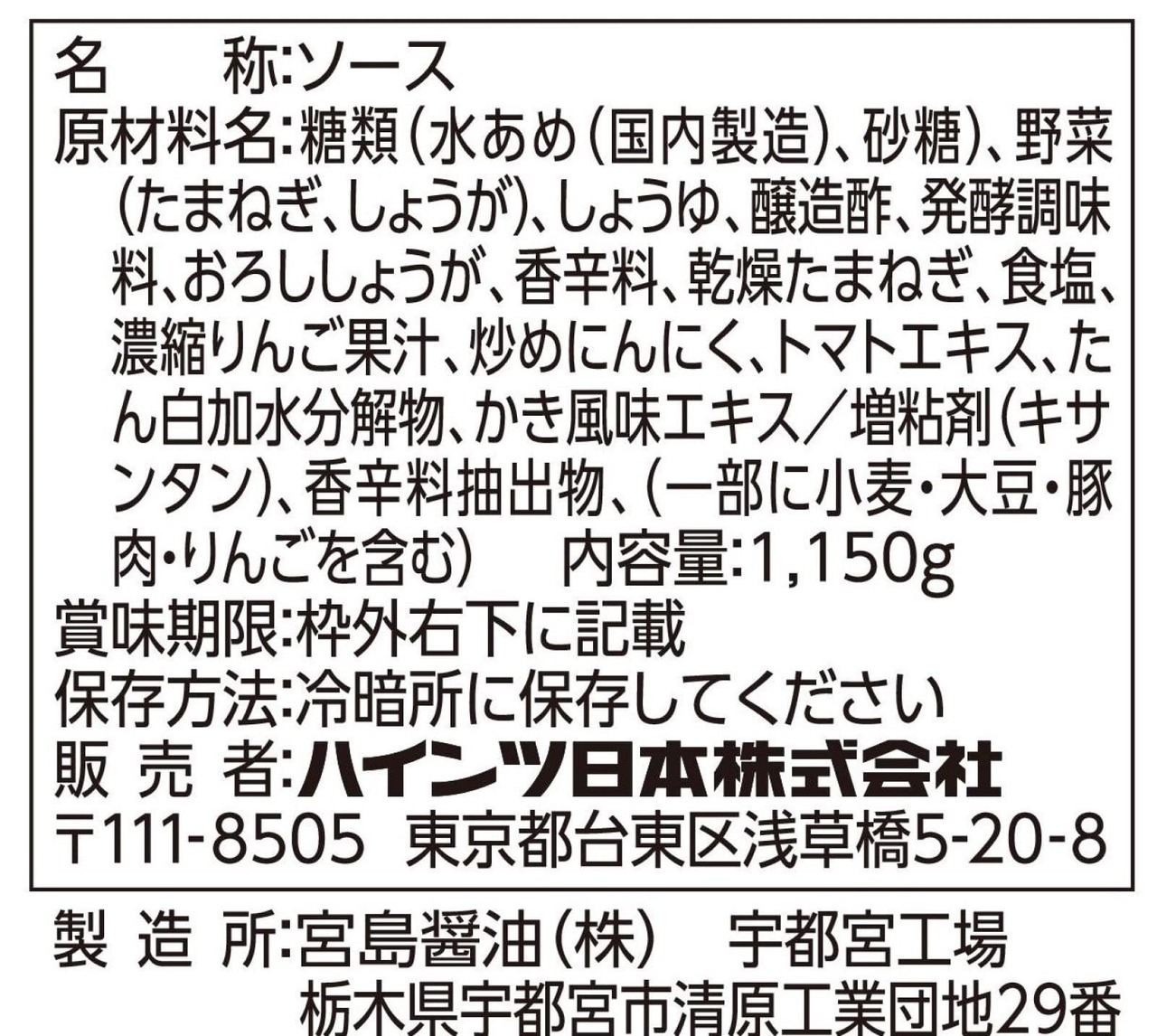 糖類(水あめ(国内製造)、砂糖)、野菜(たまねぎ、しょうが)、しょうゆ、醸造酢、発酵調味料、おろししょうが、香辛料、乾燥たまねぎ、食塩、濃縮りんご果汁、炒めにんにく、トマトエキス、たん白加水分解物、かき風味エキス/増粘剤(キサンタン)、香辛料抽出物、(一部に小麦・大豆・豚肉・りんごを含む)
